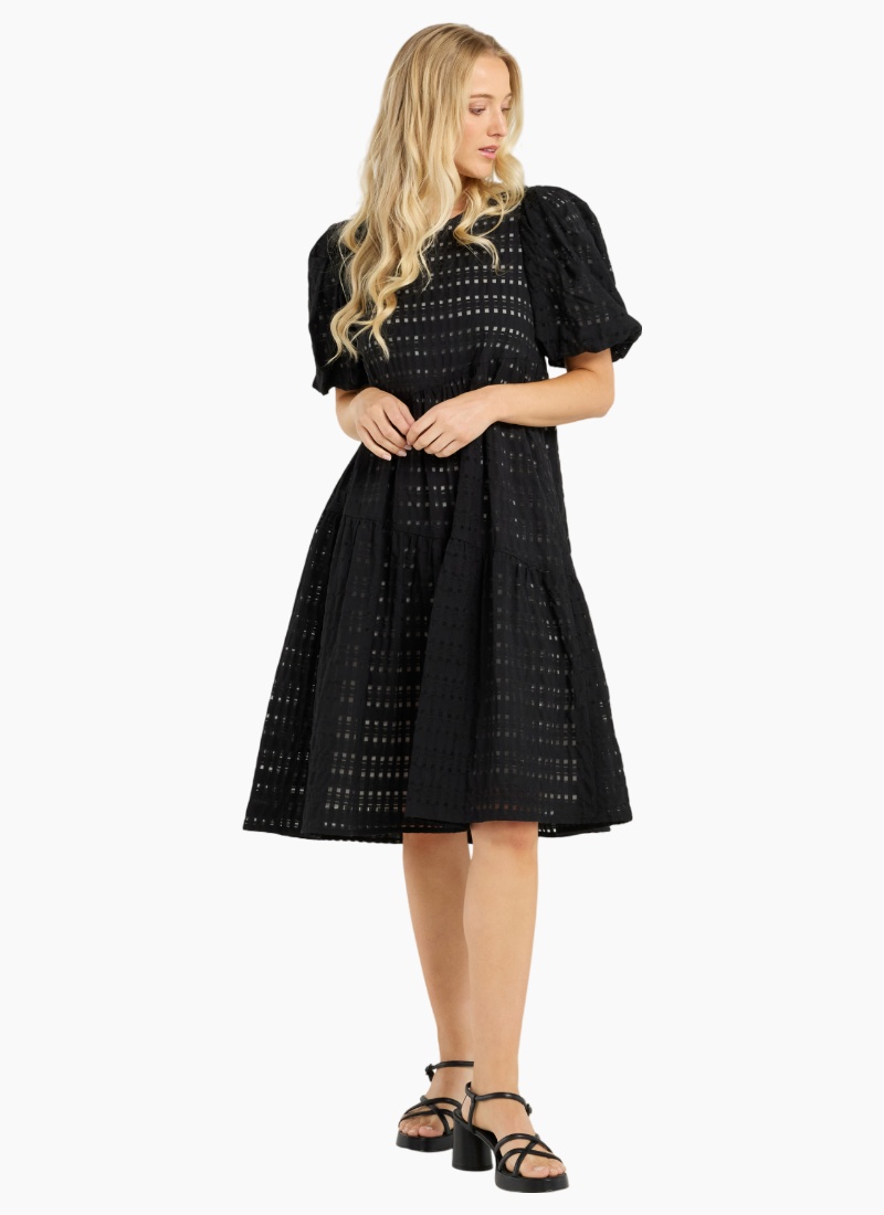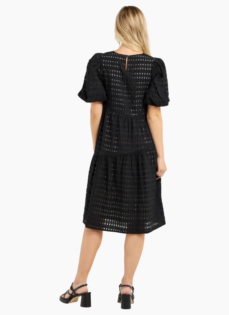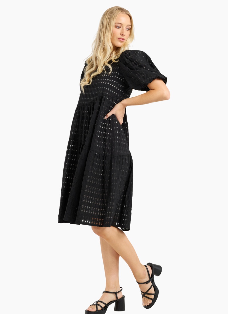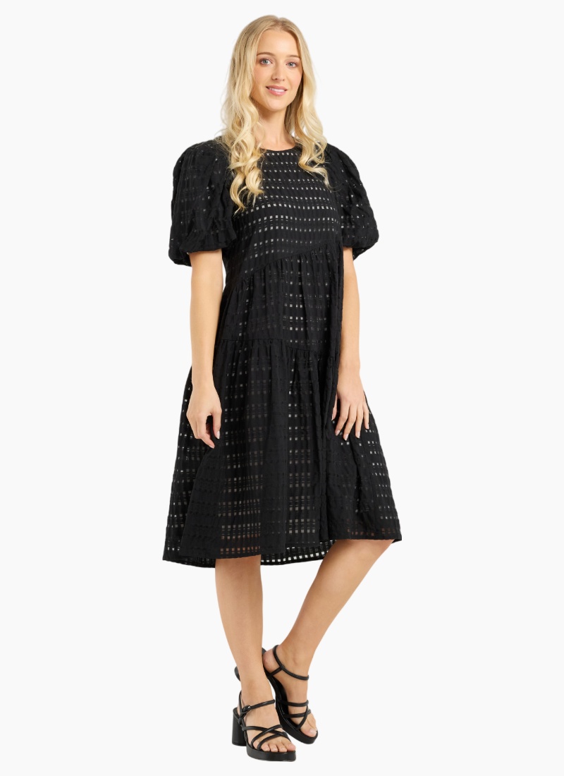 Get ready to embrace effortlessly cool vibe in our cute Becks Dress. Showcasing pretty puff sleeves for a playful touch, while the flared body with a asymmetric skirt panels adds movement and ease. The round neck and the lovely rayon blend fabric ensures comfort and style all day long. A must have for summer, dress up with strappy sandals or down with flats. 52% Cotton18% Rayon 15% Linen 15% Polyester 100% Rayon
