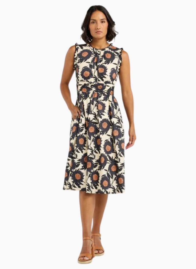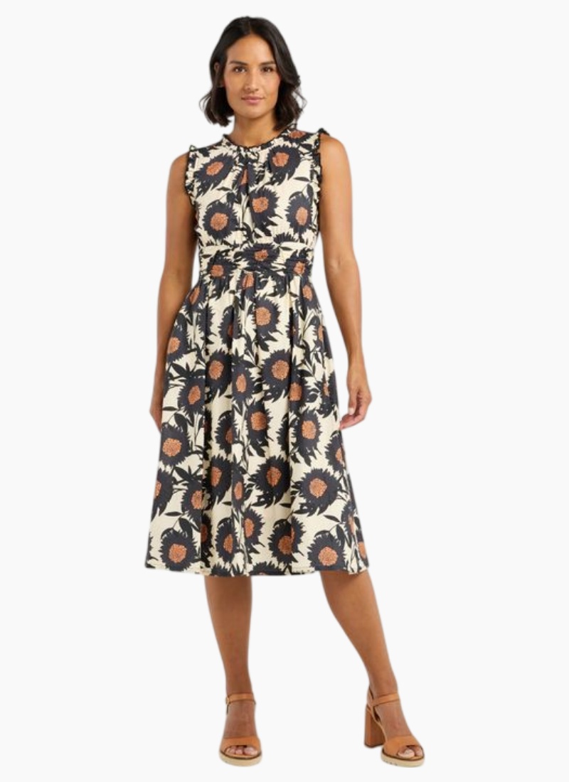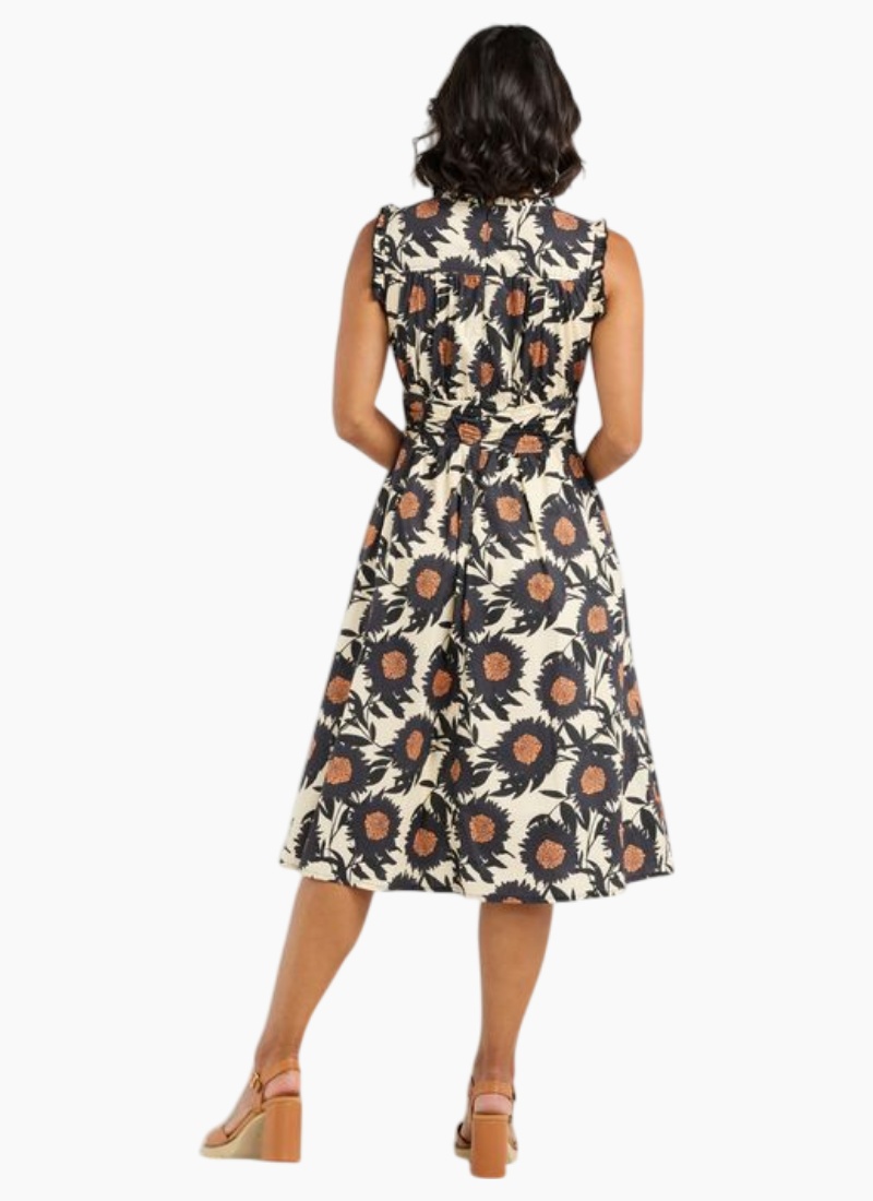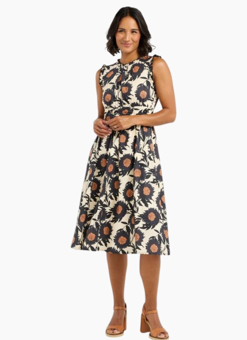 Introducing the Jackie Dress from Et Alia. This sleeveless, midi-length piece features a defined waist and a bold floral print for effortless daytime elegance.Romantic yet tailored, this sleeveless dress features a beautifully fitted bodice and a nipped-in waist that flows into a softly structured A-line skirt. Delicate frill detailing at the neckline and armholes adds a feminine touch, while piping detail at the waist highlights the more fitted silhouette. Perfect for this summer BBQ's with sandals or with a heel for a summer wedding.