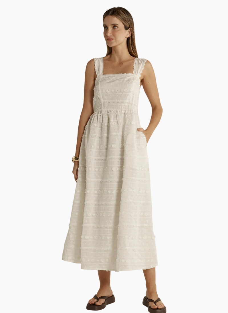 The Sierra Lace Dress captures timeless elegance through intricate texture. Fully lined and crafted in detailed lace, it features adjustable straps and a flowing maxi silhouette. The perfect blend of femininity and sophistication. Effortless beauty with refined allure.-Fully lined -Textured lace details -Maxi Length -Adjustable straps Fabric and Care Main - 85% Lyocell 15% Polyester / Lining - 100% Cotton / Embroidery - 100% Polyester Cool gentle hand wash and cool iron Fit Notes Regular fit Our model Delainey is 176cm tall and wears size 10.