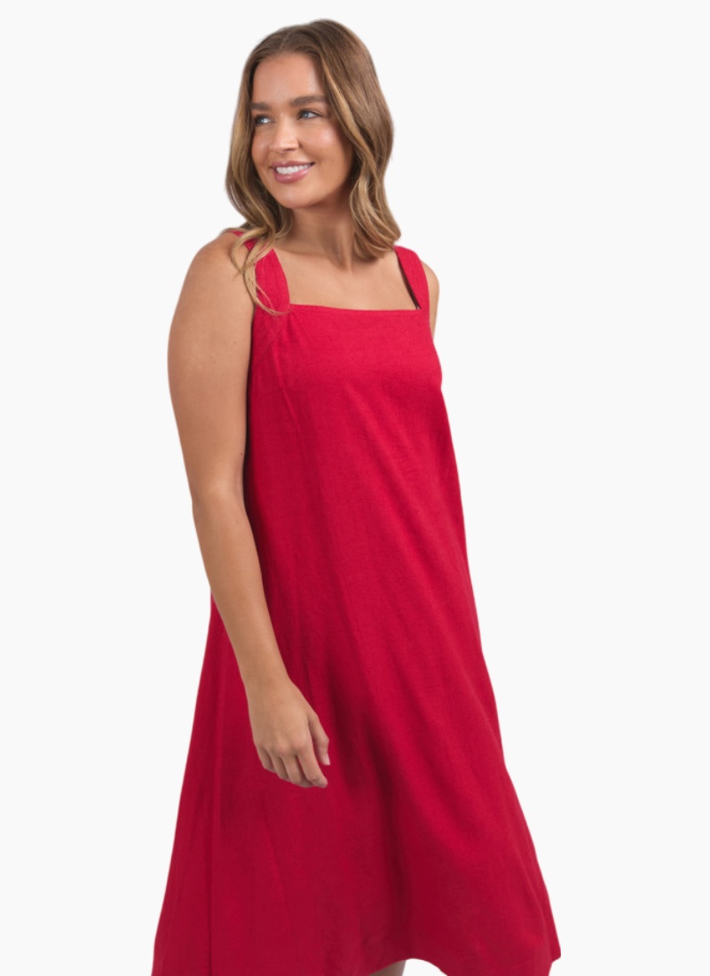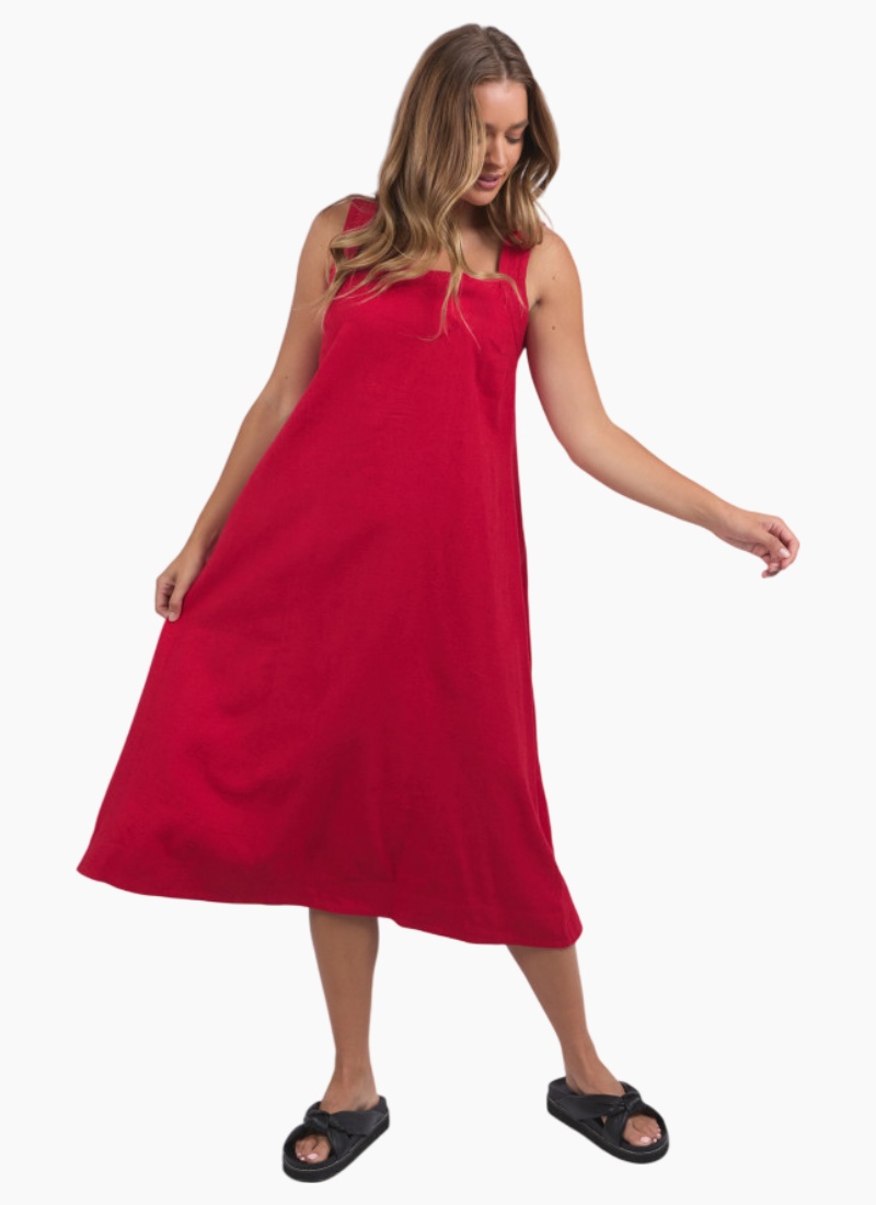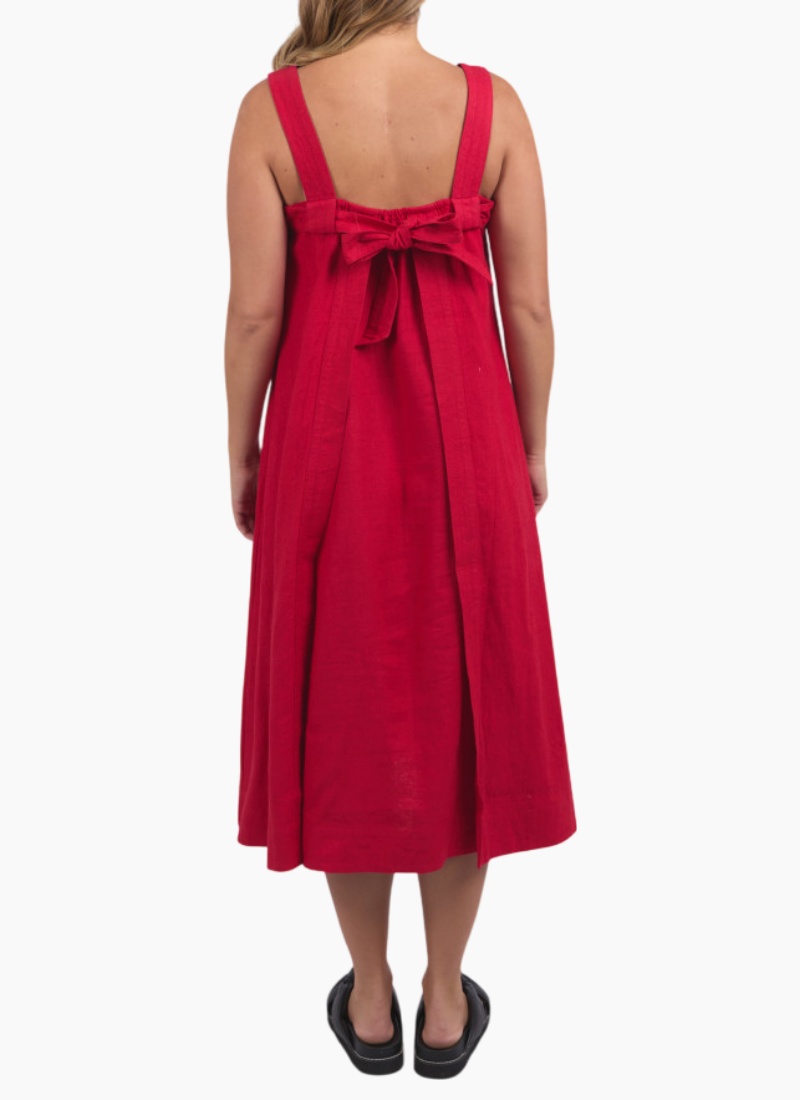 Easygoing with a playful twist. The Lourdes Dress features a relaxed fit with an open back, layered underlay, and a sweet back tie detail that brings the charm. Light, floaty and full of personality - this one's made for warm days and fun plans.