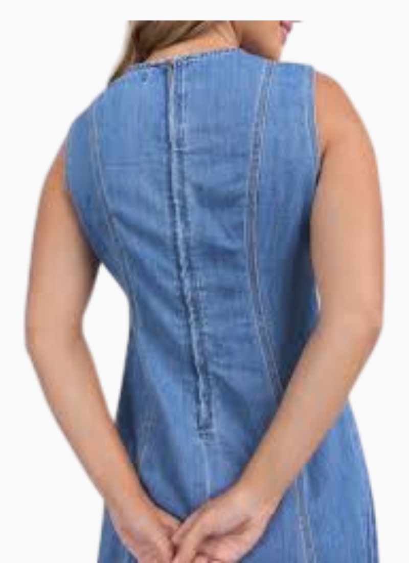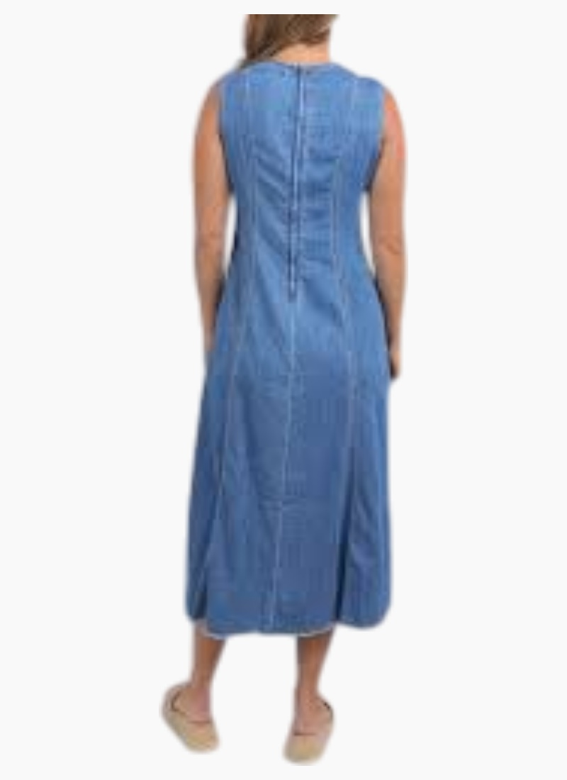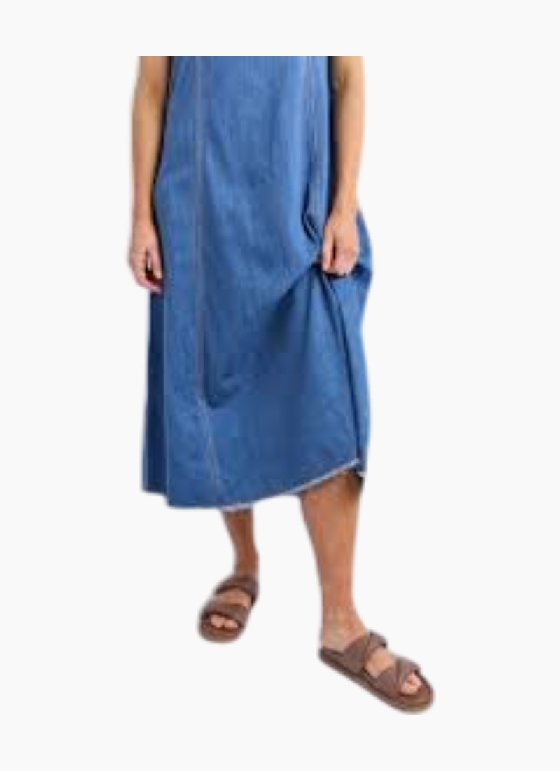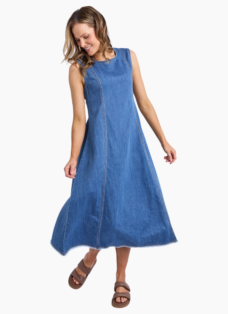 - Relaxed shift silhouette in a classic denim blue colour, falling to a flattering midi length