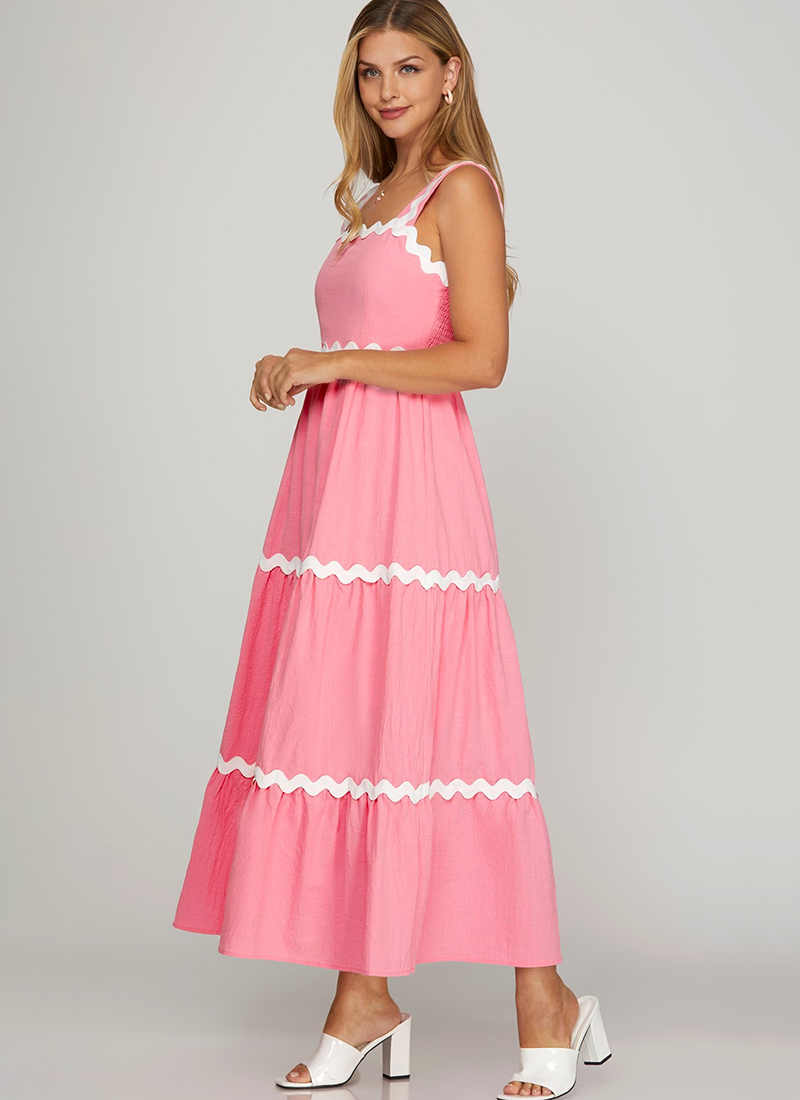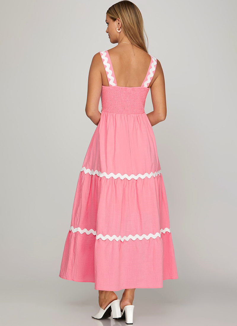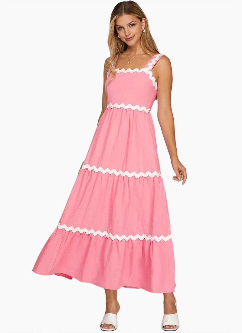 A cheerful rickrack design enlivens this crisp cotton blend midi designed with a modern square neck.