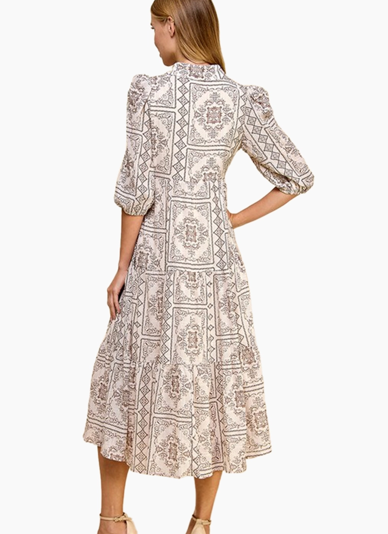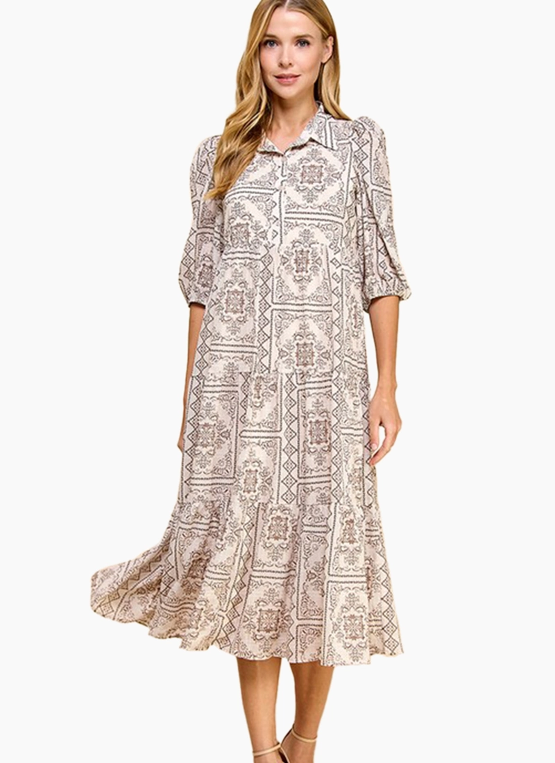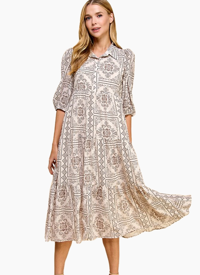 Print midi shirt dress with shirt collar, with half sleeves and tiered skirt.