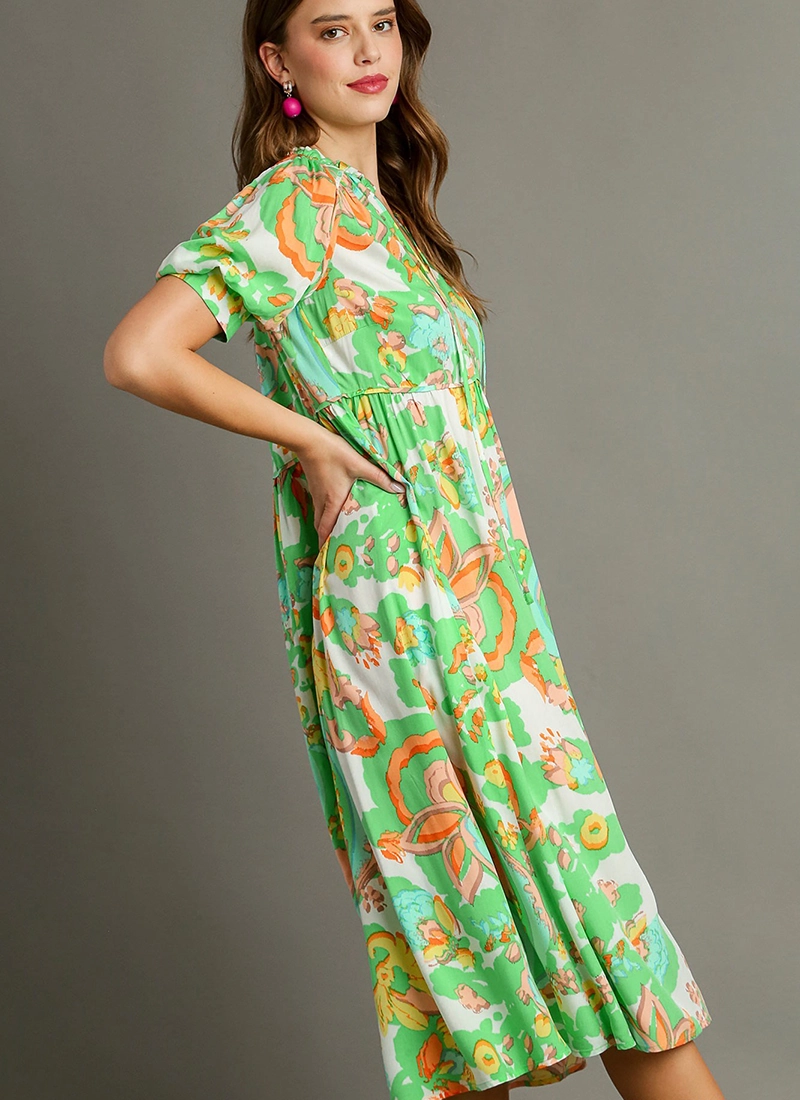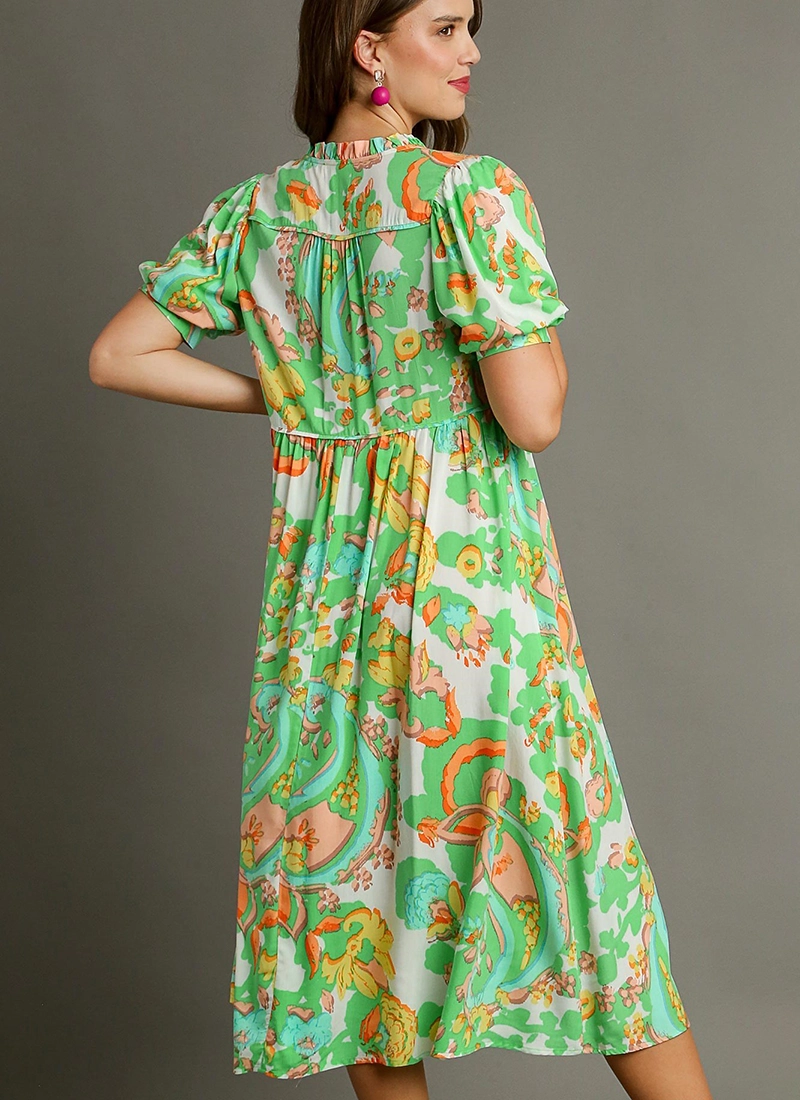 Paisley tiered V neck midi dress with ruffle detail & short puff sleeves