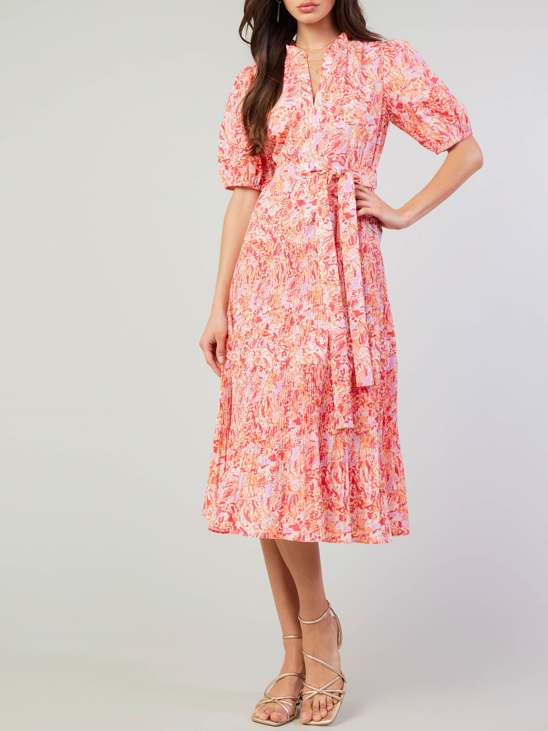 Petite pleats detail the tiered skirt of this split neck print dress with puff sleeves.