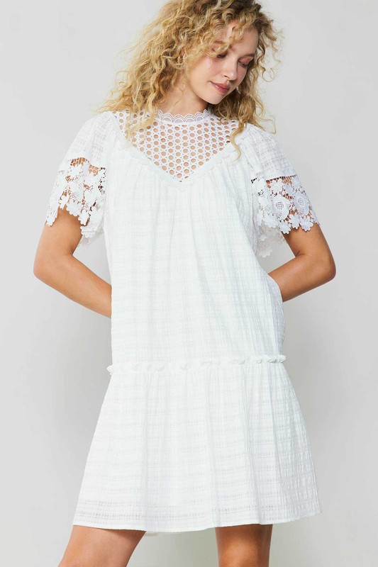Pretty lace decorates the yoke & short sleeves of this summer dress.