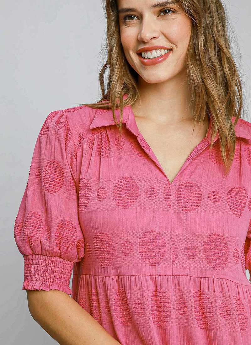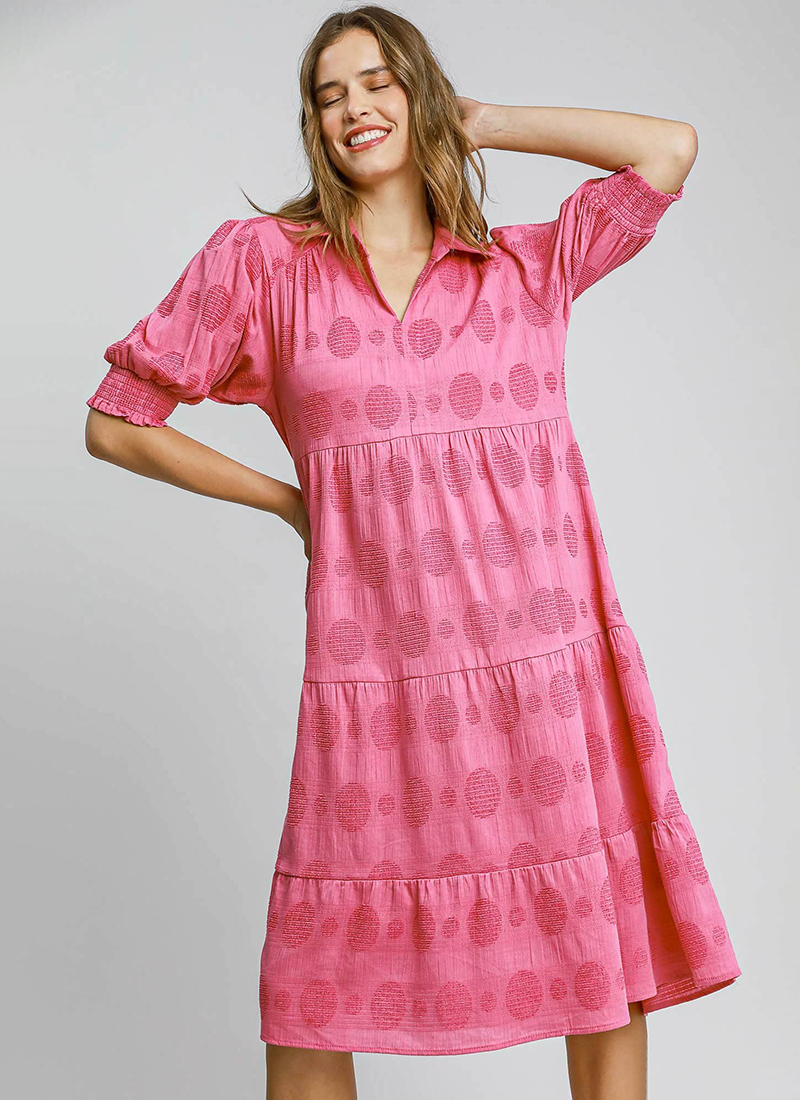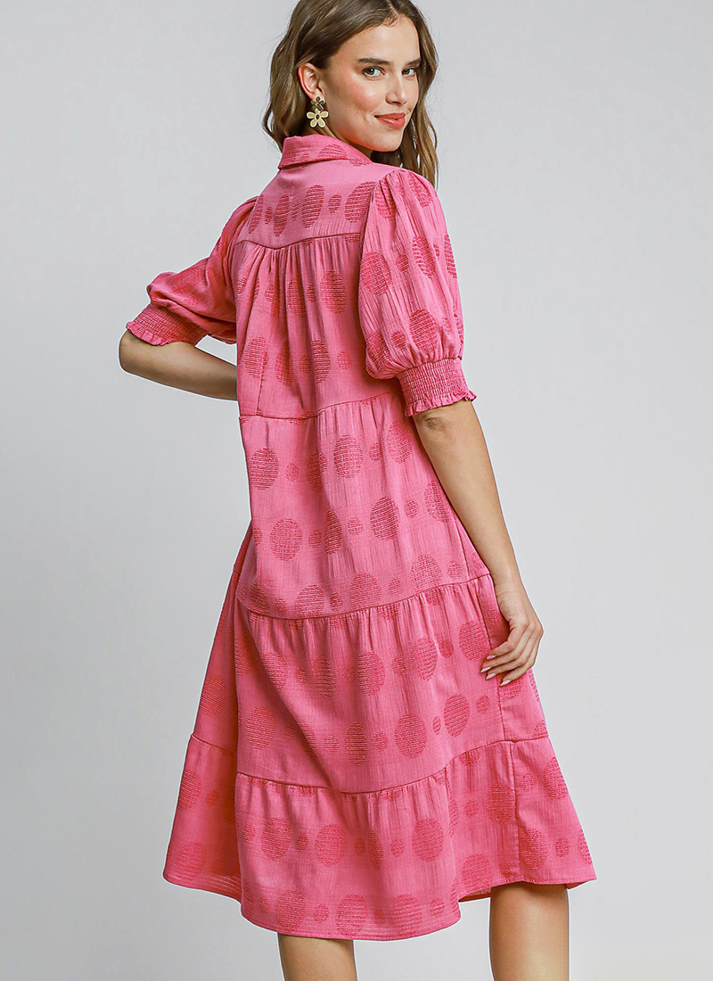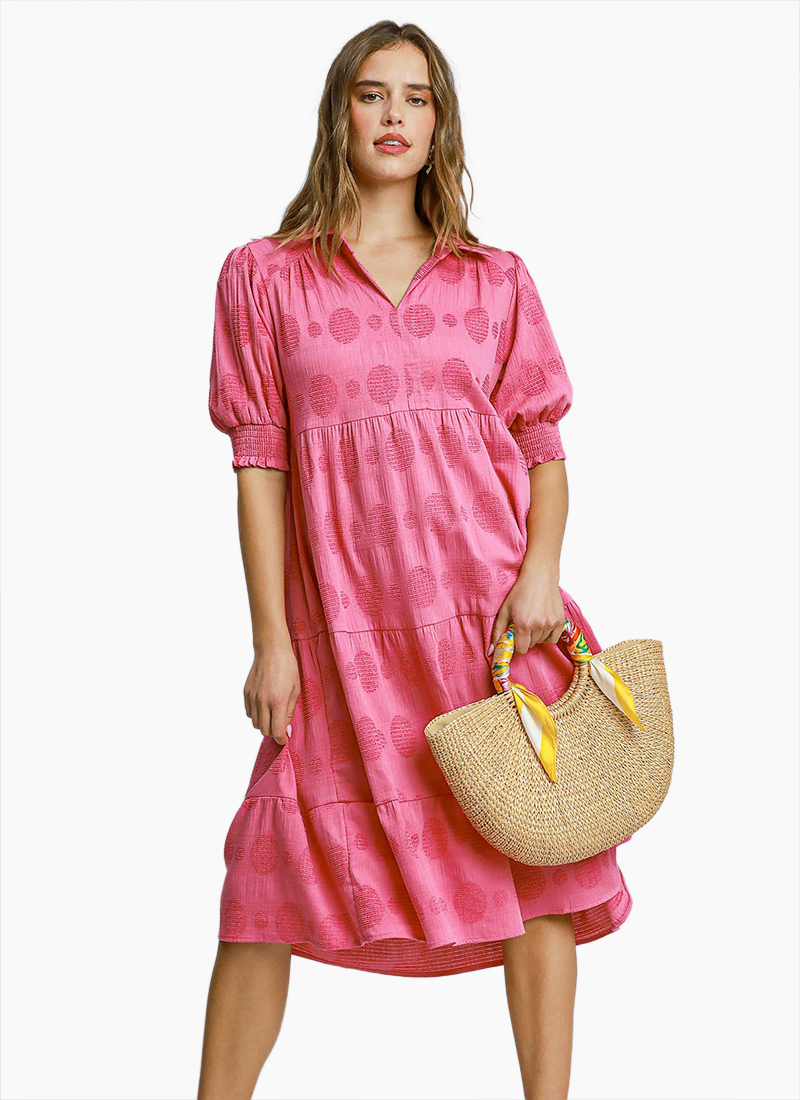 Solid dotted jacquard midi dress with collared split v neckline & puff sleeves