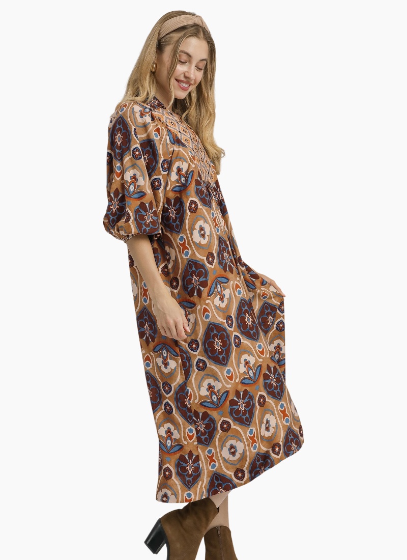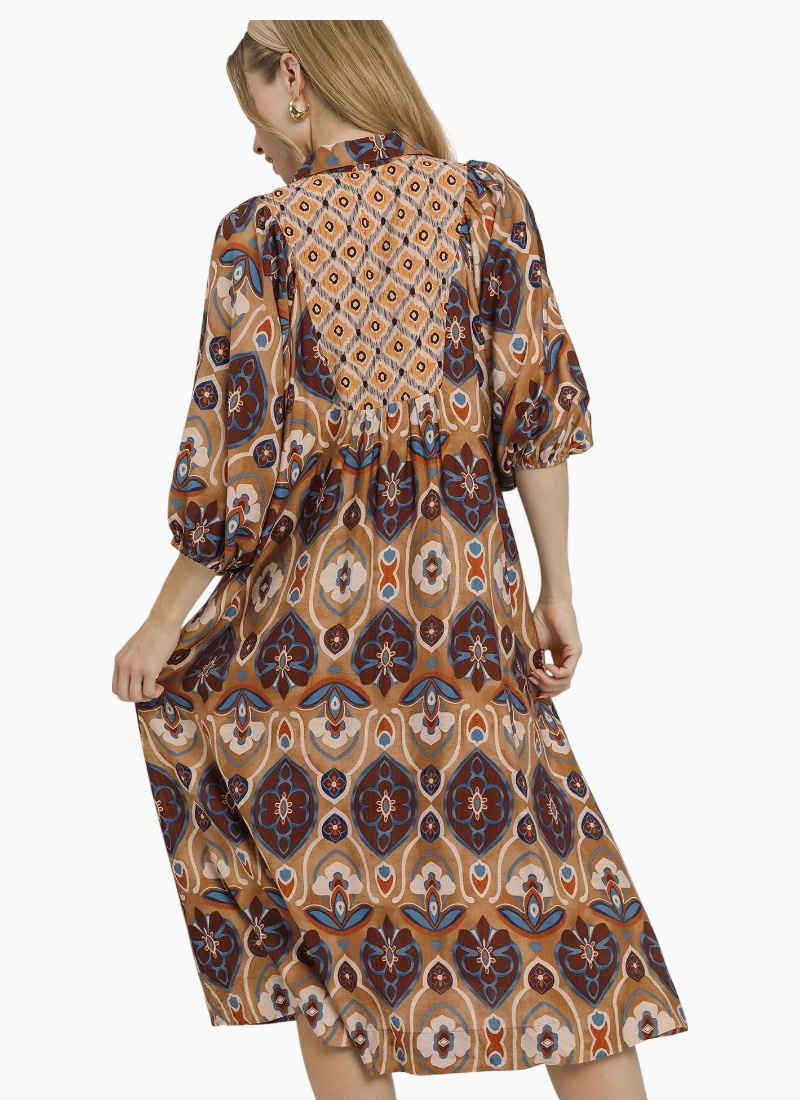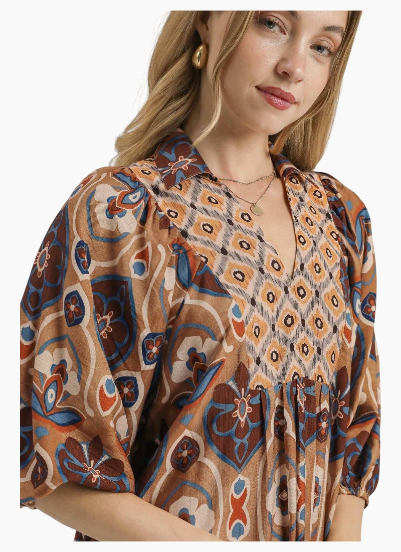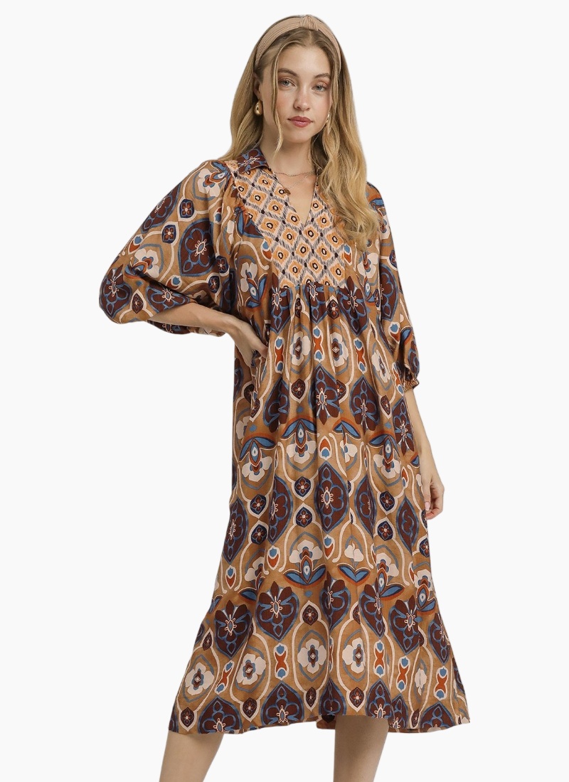 Abstract print collared midi dress with V - neck & 3/4 balloon sleeves.