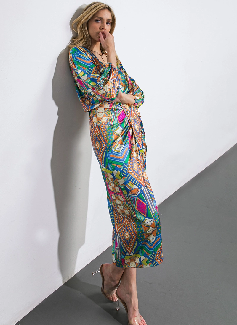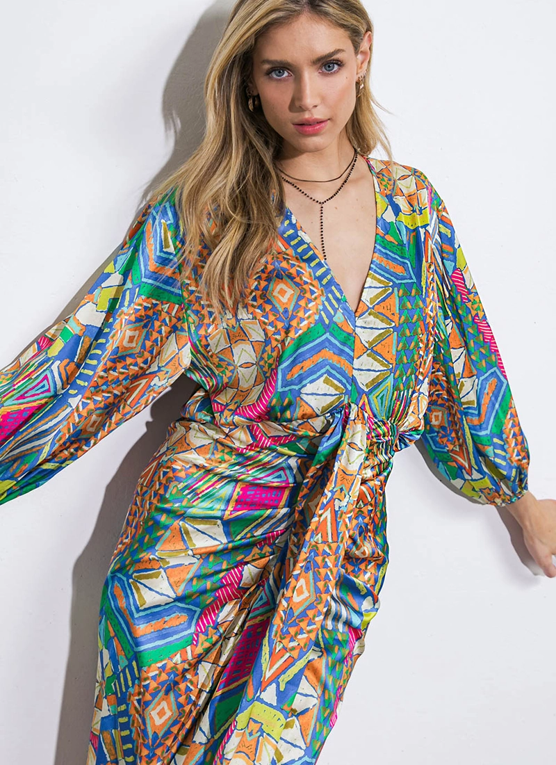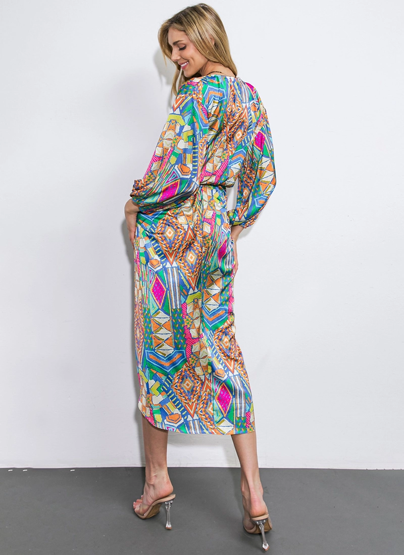 Playful print features on this dress shaped with a V neckline, center ruching & kimono sleeves.