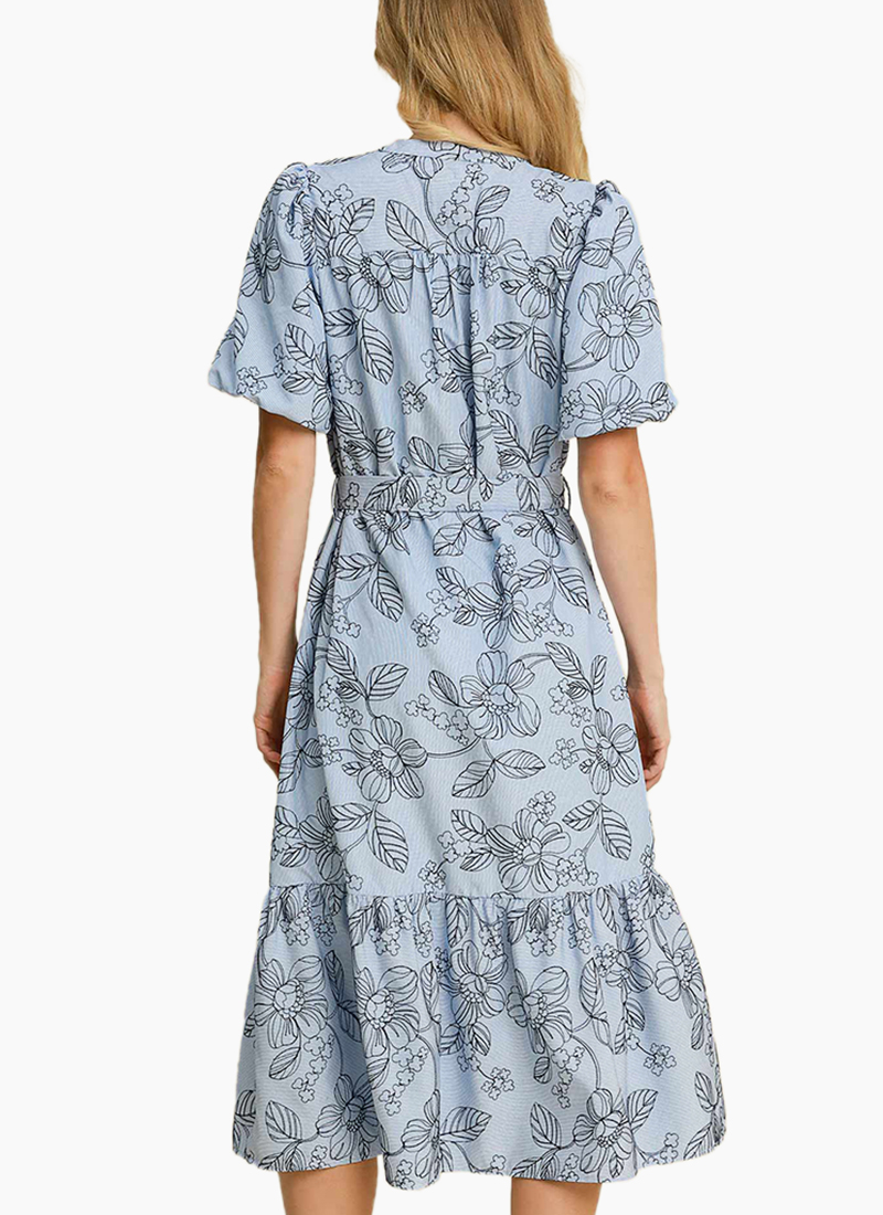 Pretty puffed sleeves frame this lightweight cotton blend midi dress decorated in delightful blooms and tethered at the waist by a matching removable tie belt.