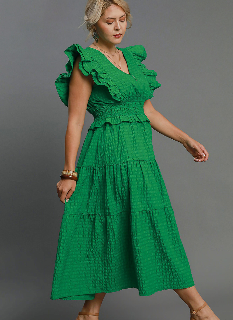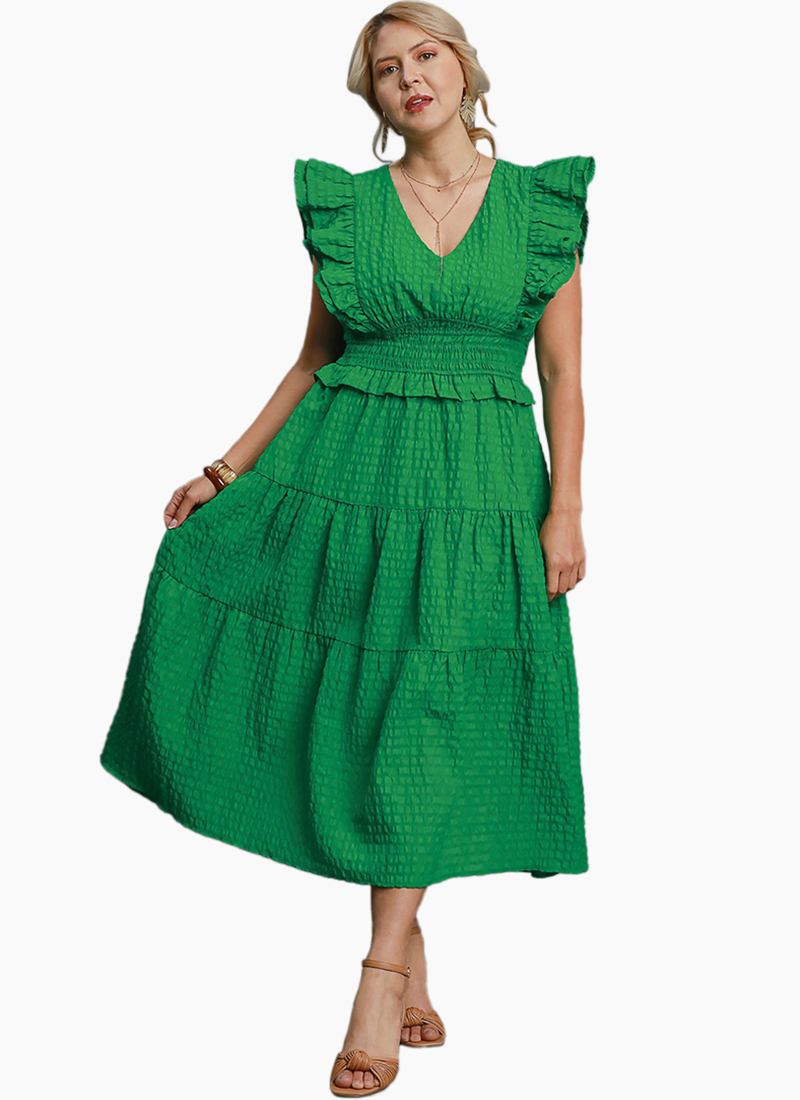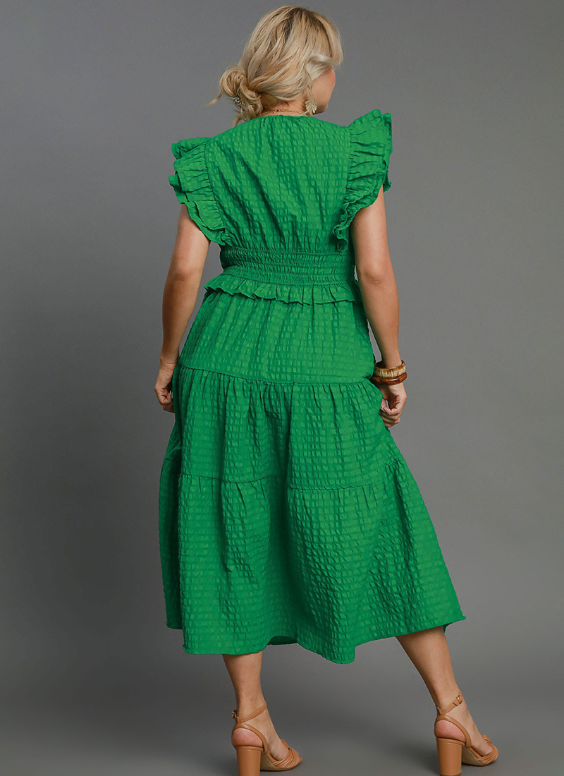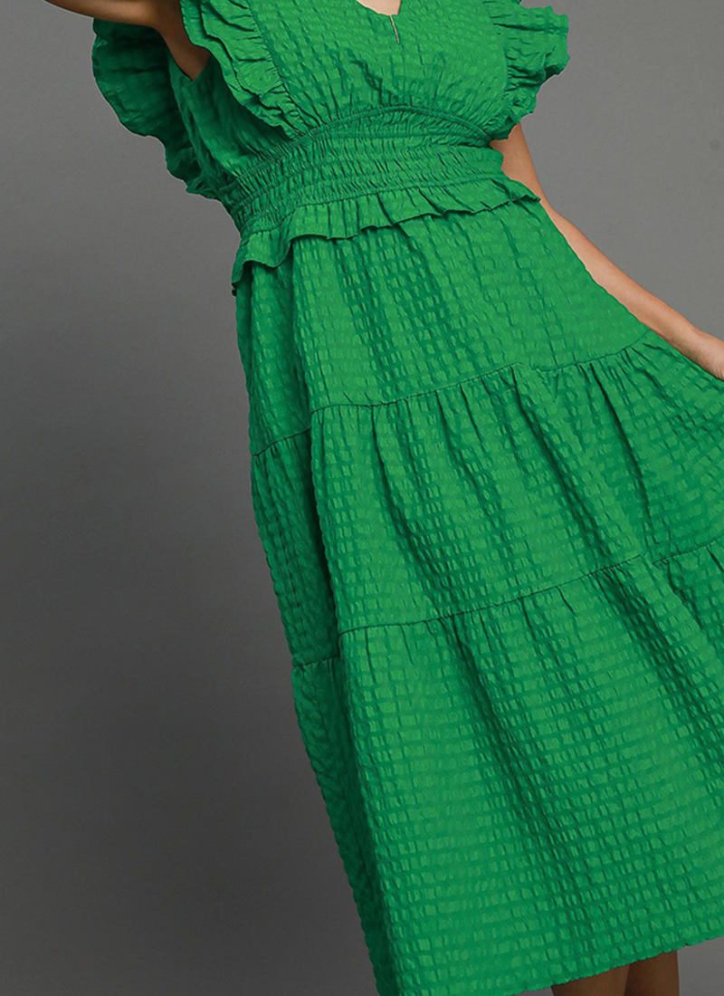 Ruffles and frills work with vibrant V neck dress you'll wear on repeat.