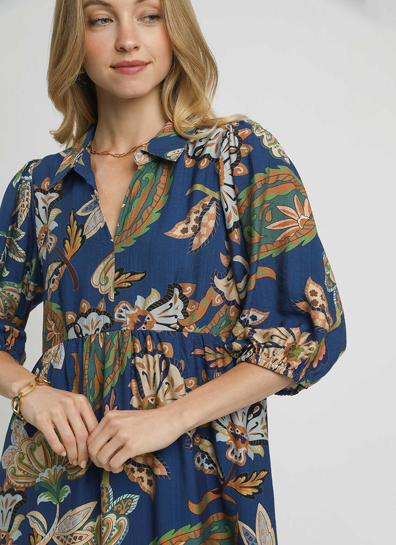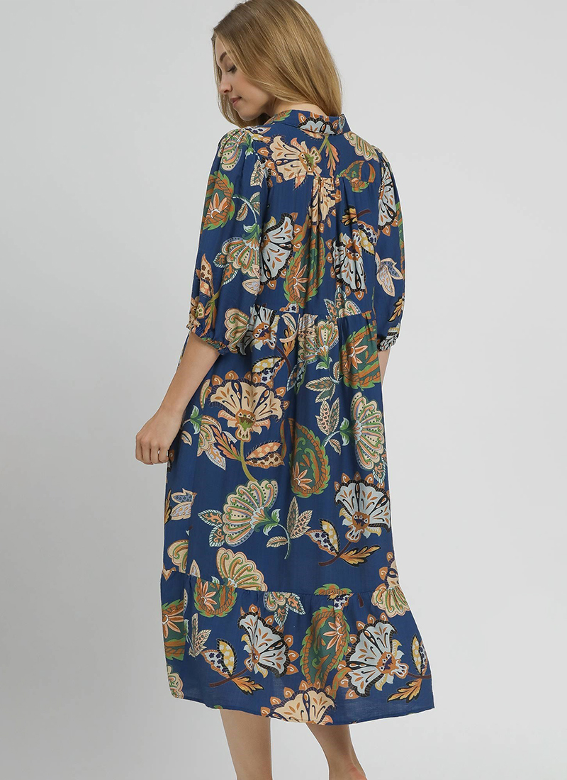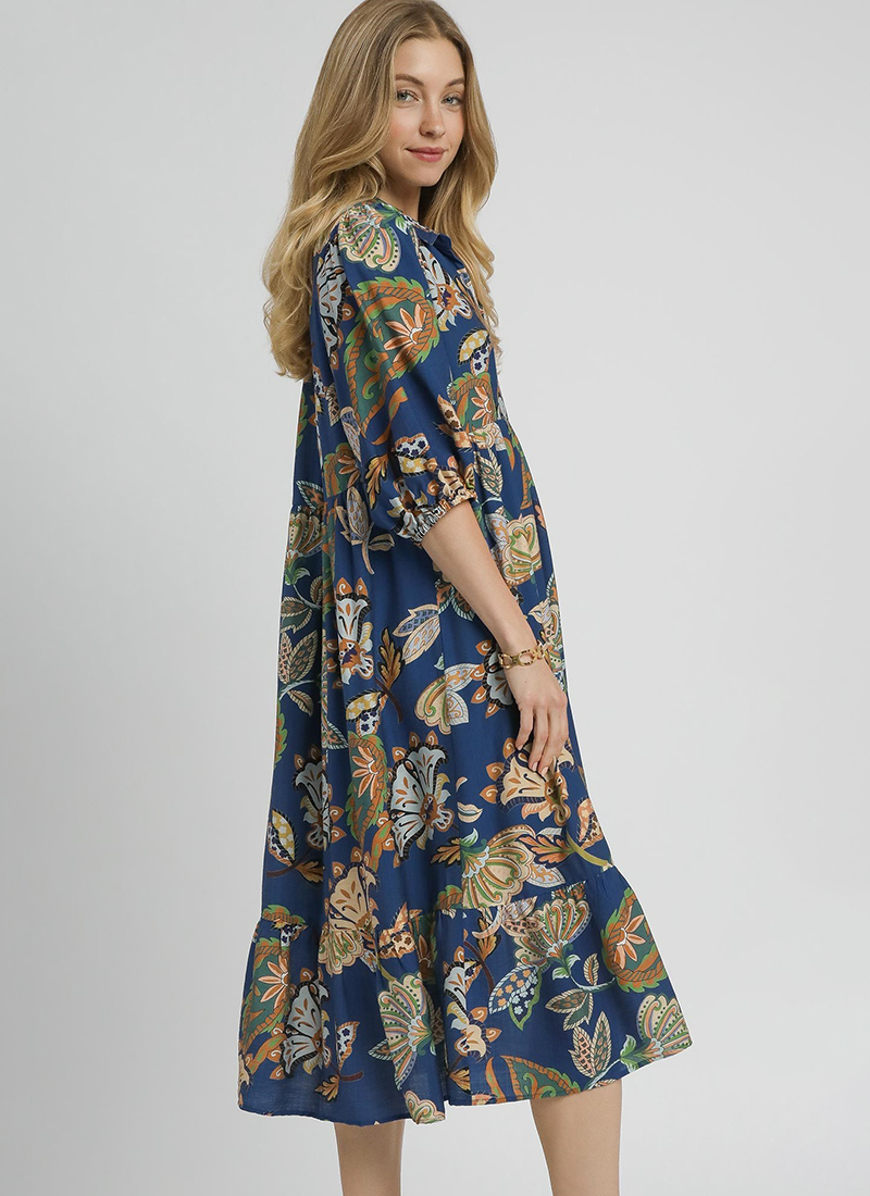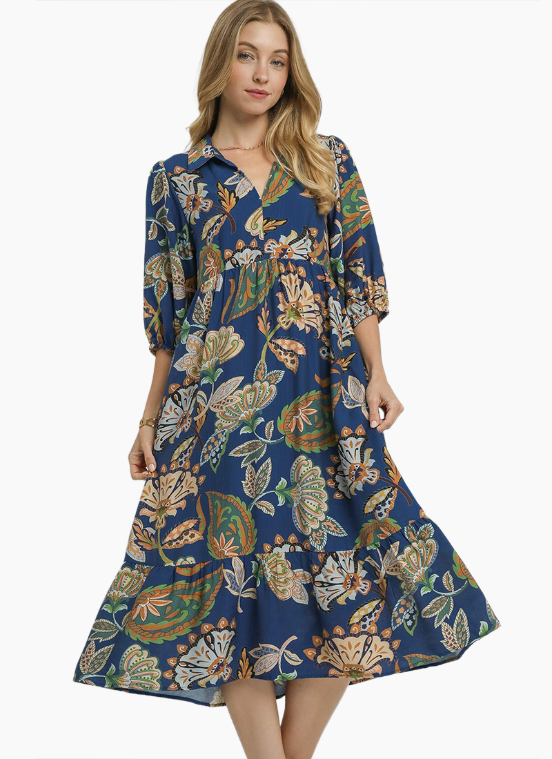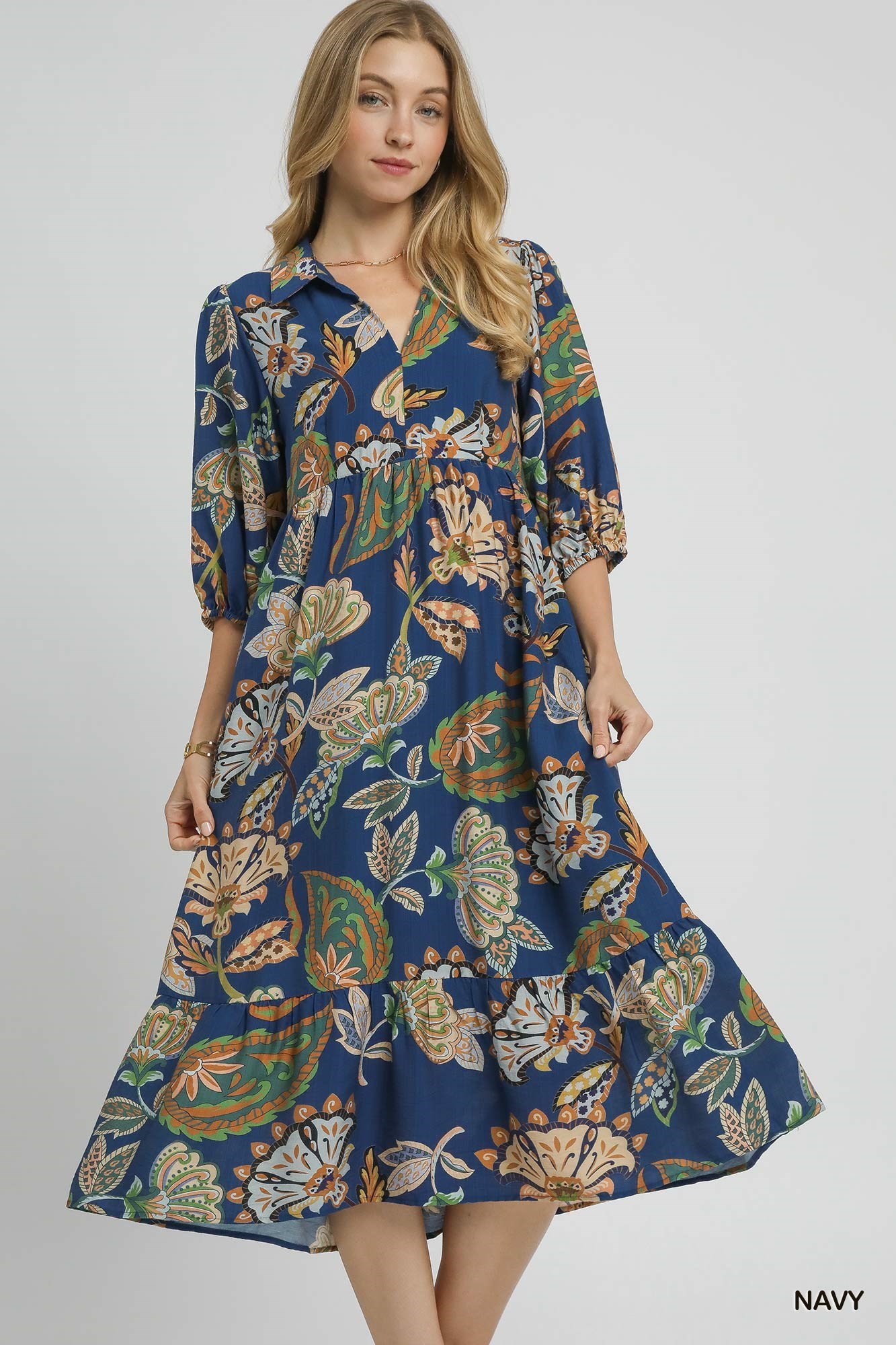 Paisley tiered midi dress with 3/4 cuff sleeves
