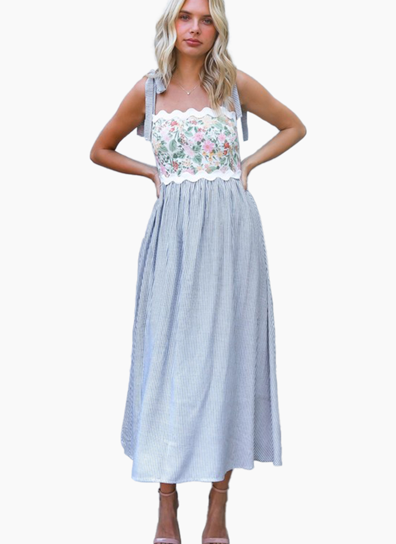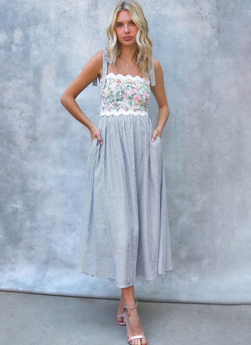 Contrasting rickrack trims & print heighten the warm-weather vibe of this charming sundress.