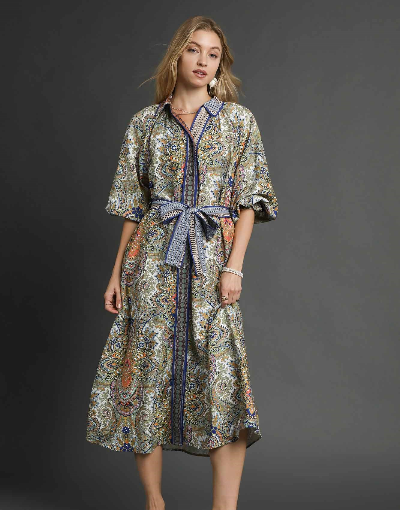 Paisley tiered midi dress with 3/4 cuff sleeves