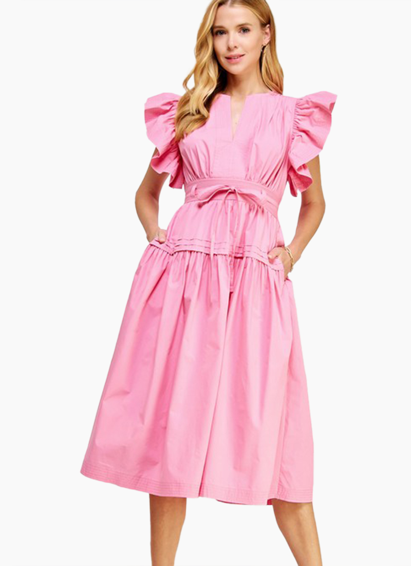 Ruffles & pintuck detail perfectly frame this midi dress cut from crisp cotton for a sunshine-ready look.