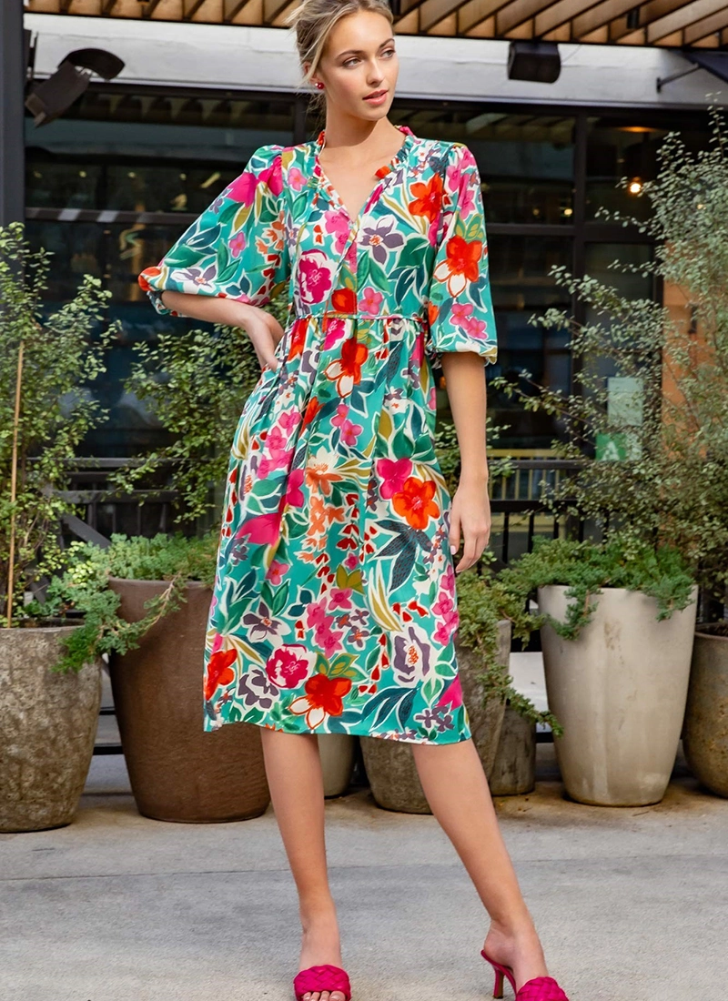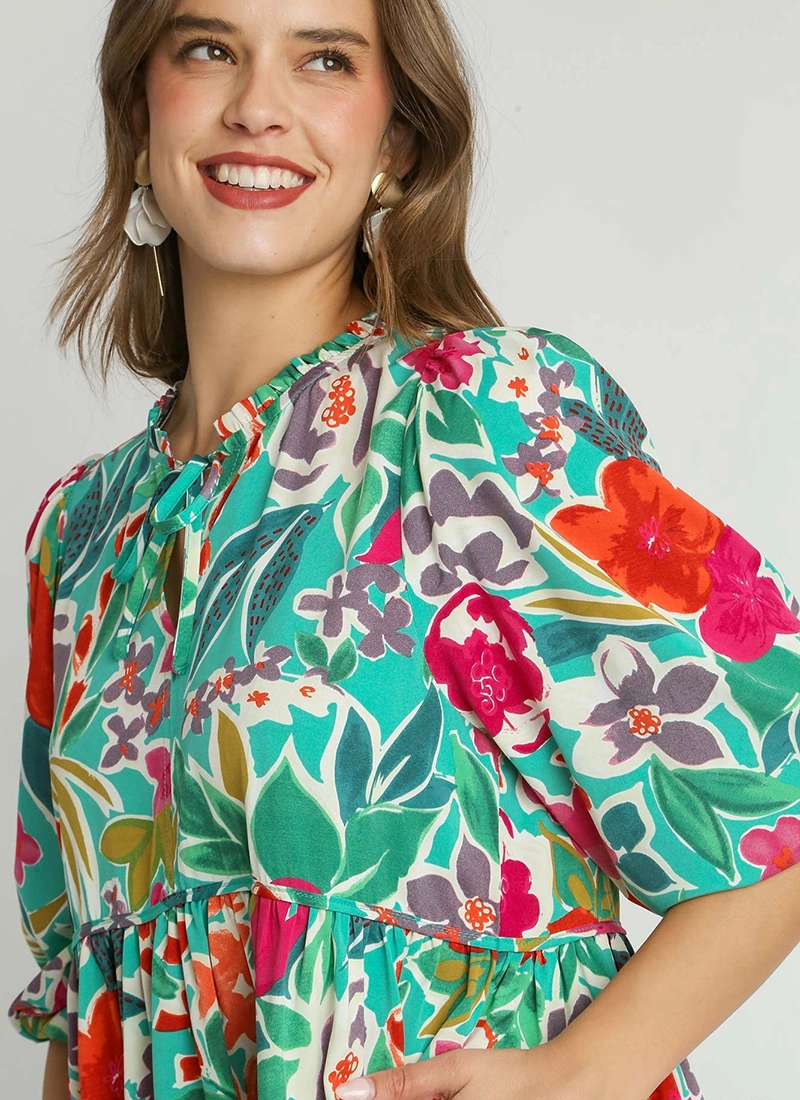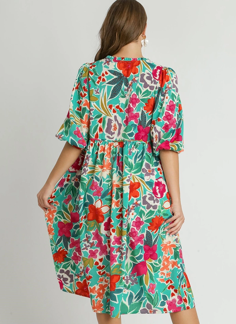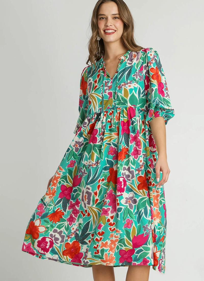Floral print dress with 3/4 puff sleeves, ruffle trim & tie at neckline.