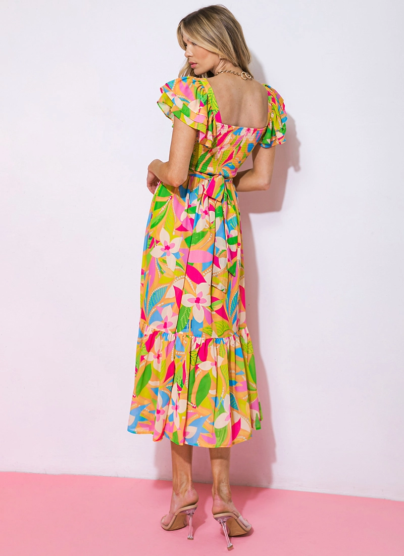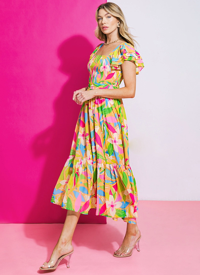 Smocking at the bodice creates shape on this beautifully print midi dress framed by fluttery ruffle sleeves and a flounce hem.
