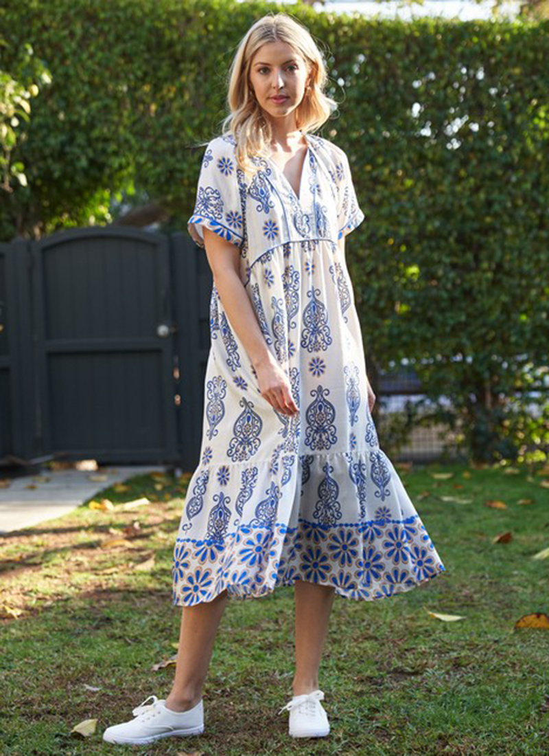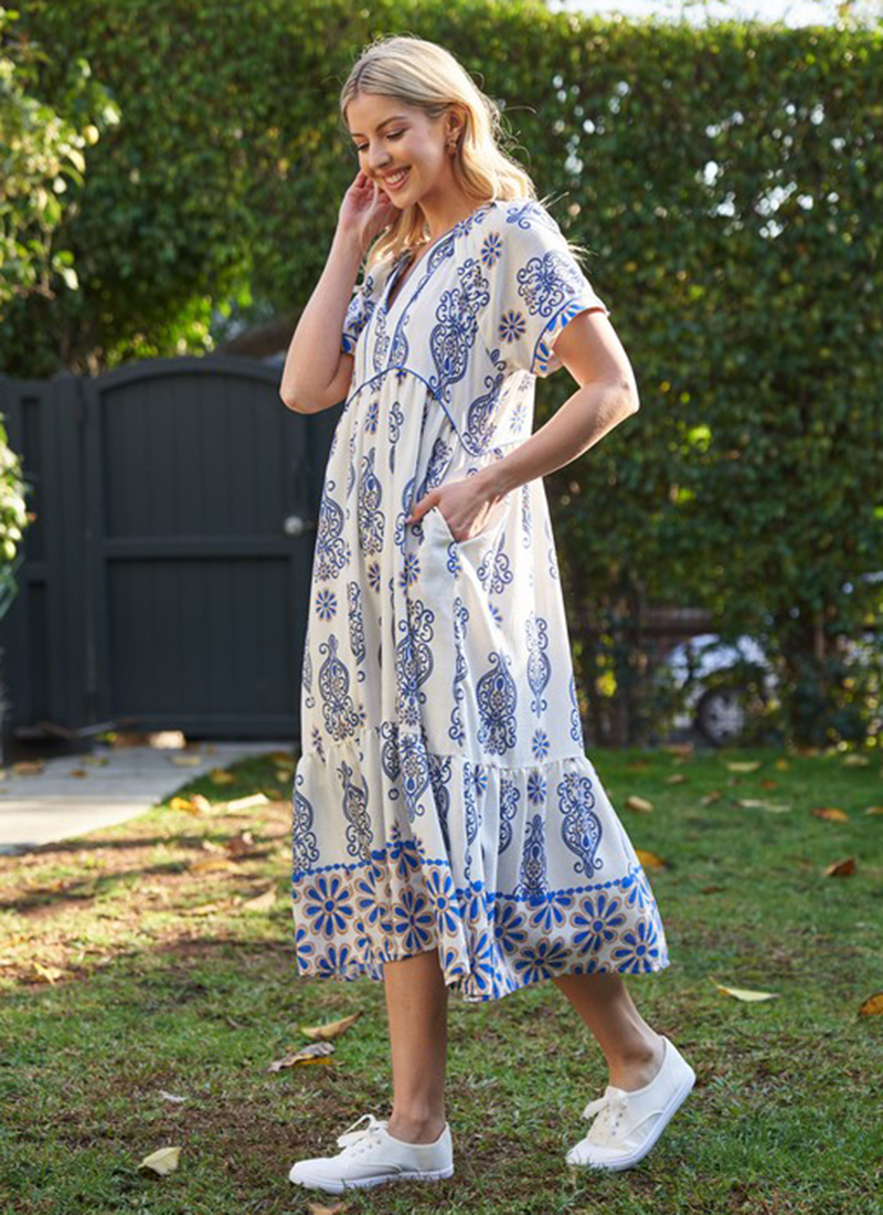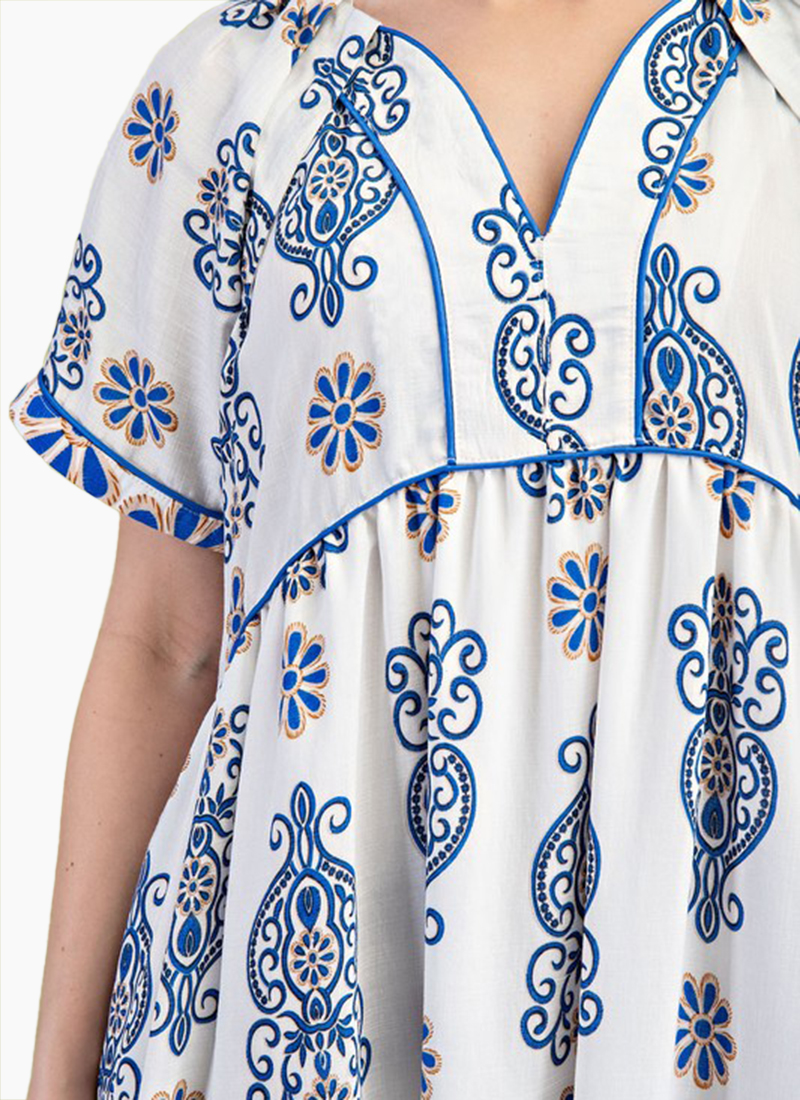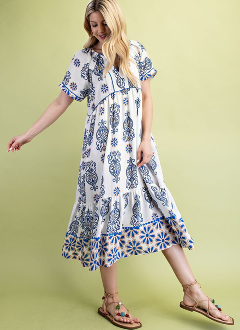V-Neck Mixed Print Midi Dress with Contrast Piping Details