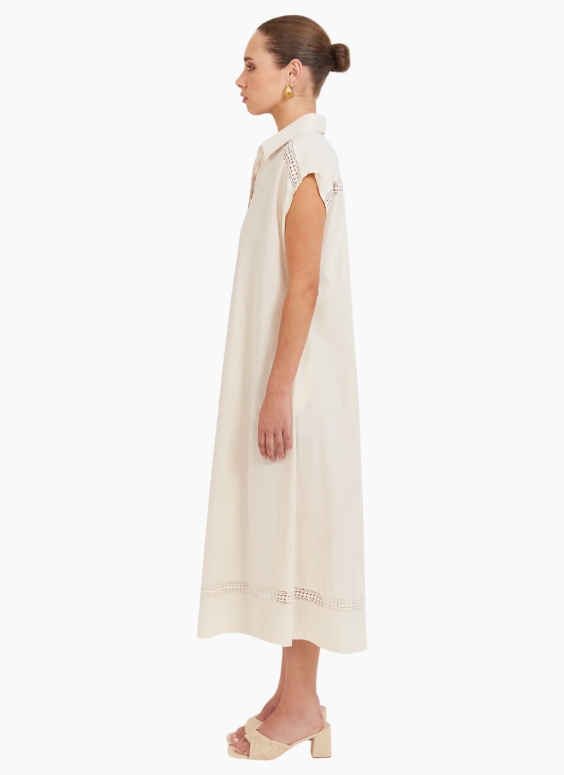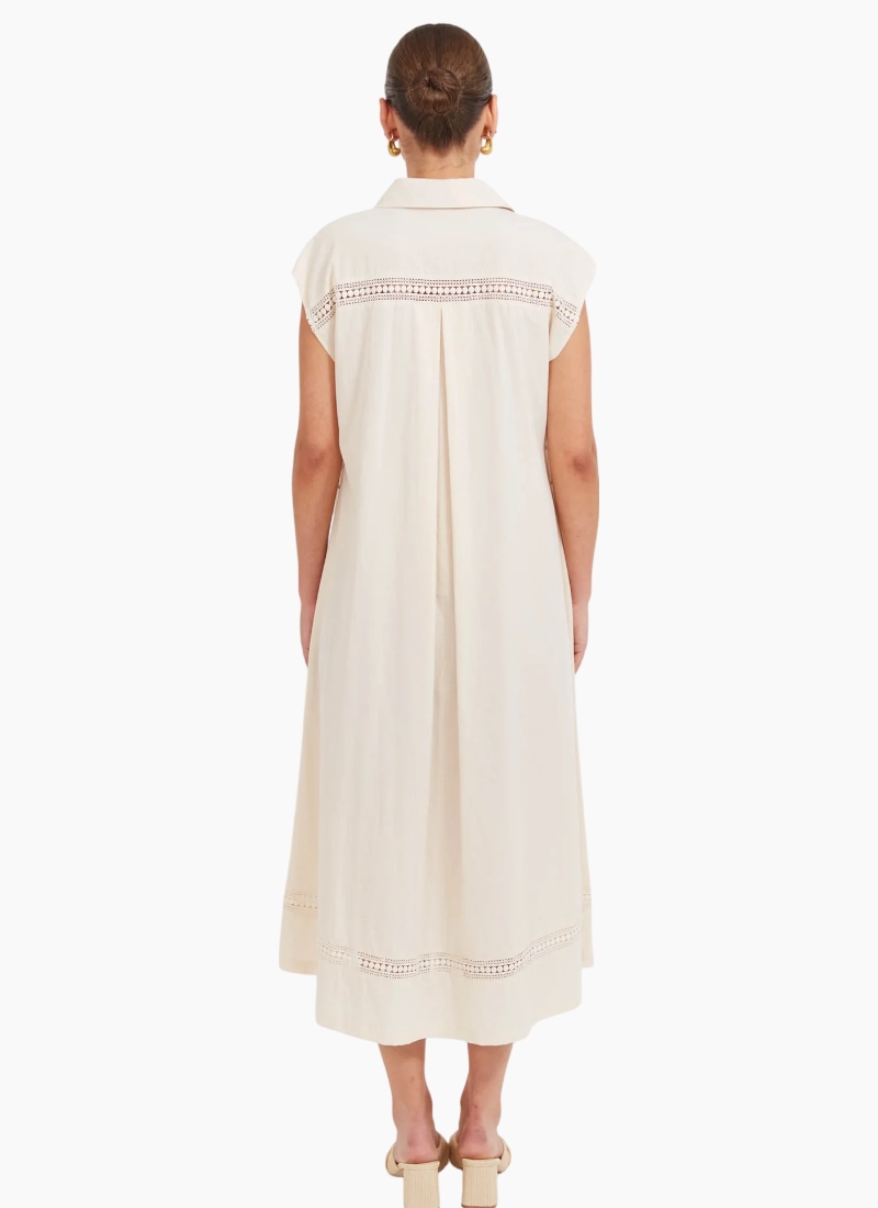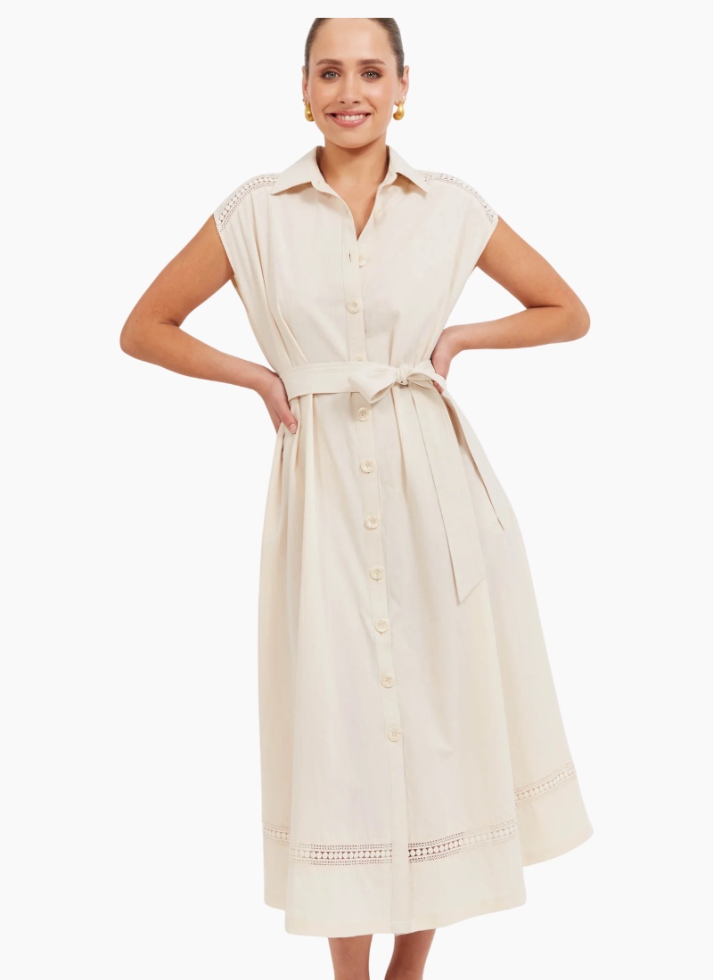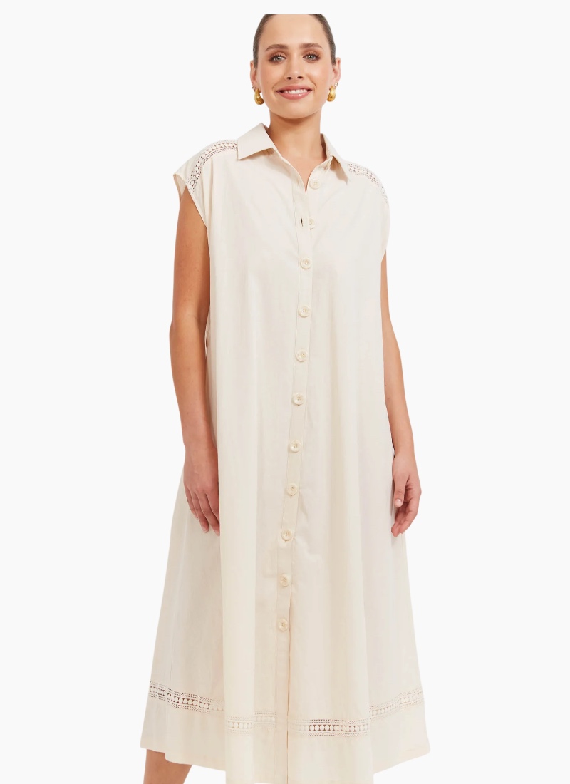 One piece, endless styling potential. Crafted from crisp 100% cotton, the Santos Sleeveless Shirt Dress features a collared button-through front, extended shoulder sleeves for extra arm coverage, and lace inserts at the yoke and hem. An inverted back pleat adds shaping, while the self-fabric belt lets you cinch the waist.Wear it fully buttoned and belted as a polished midi dress, or leave it open over a tank and shorts as a breezy duster. With internal side pockets and a versatile design, it's your go-to for everyday dressing, travel layering, or running errands in style. Collared button-through style Extended shoulder sleeve Lace inserts at yoke and hem Includes self-fabricated belt Centre back inverted pleat for shaping Internal side pockets Midi length Can be worn as dress (with or without belt), as well as an unbuttoned duster 100% cotton