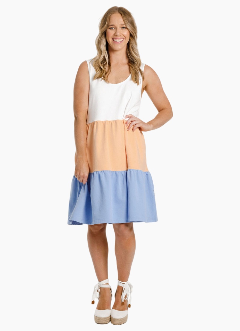 - Sleeveless scoop neck and gentle gathered tiers create a flattering, easy-to-wear shape that falls just above the knee