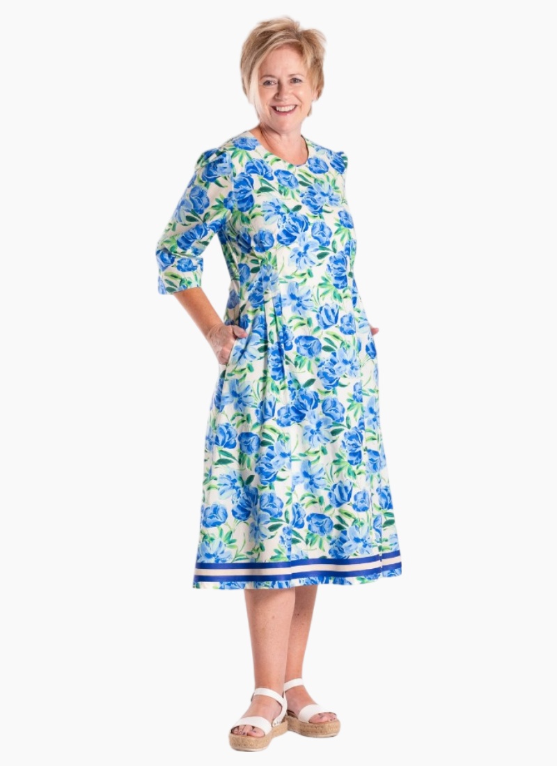 - Blue Bloom from Jellicoe. A fresh, easy-to-wear casual day dress in a vibrant blue floral print.
