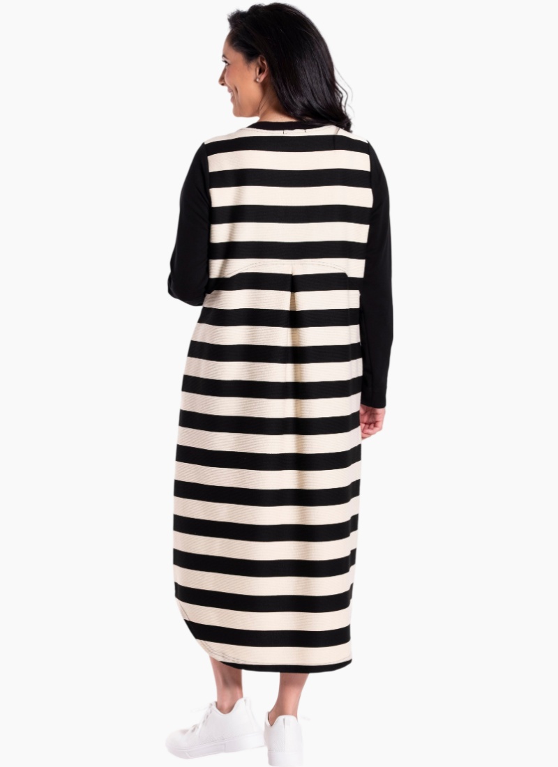 - Bold black and ivory stripe paneling with solid black long sleeves for a modern contrast in colour and texture