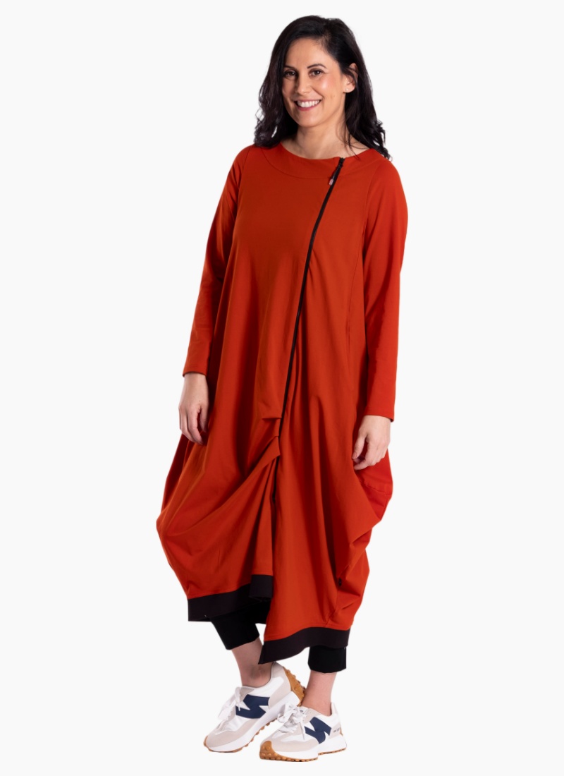 - Spiced Flame. A relaxed, artfully draped day dress in a warm burnt-orange hue that elevates everyday dressing.