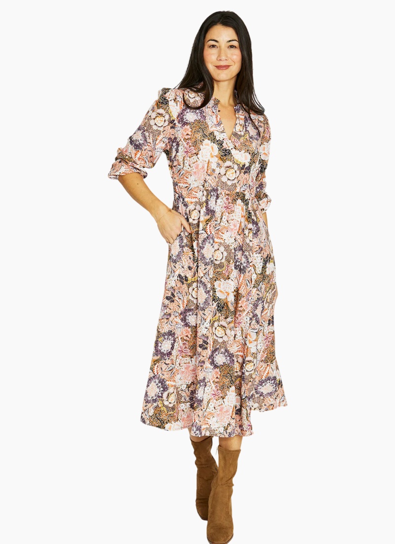 Introducing the Delicate Paisley Dress from Jump. This midi dress in a soft blush paisley print is designed for effortless daytime style.