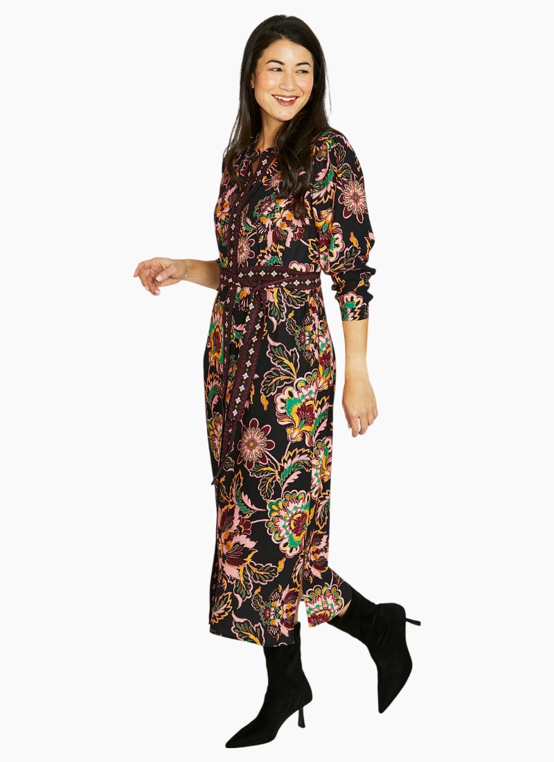 - A Casual/Day Dresses piece in a deep black ground with multicoloured floral motifs, crafted to make the colour and print pop