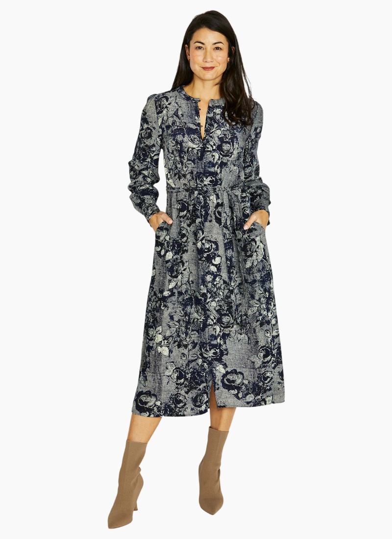Introducing the Vintage Rose Dress from Jump. A flattering navy floral casual day dress with a soft drape and midi length that effortlessly transitions from work to weekends.