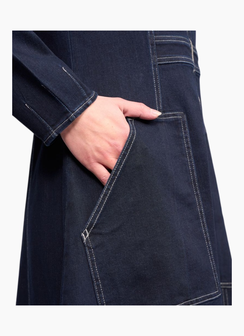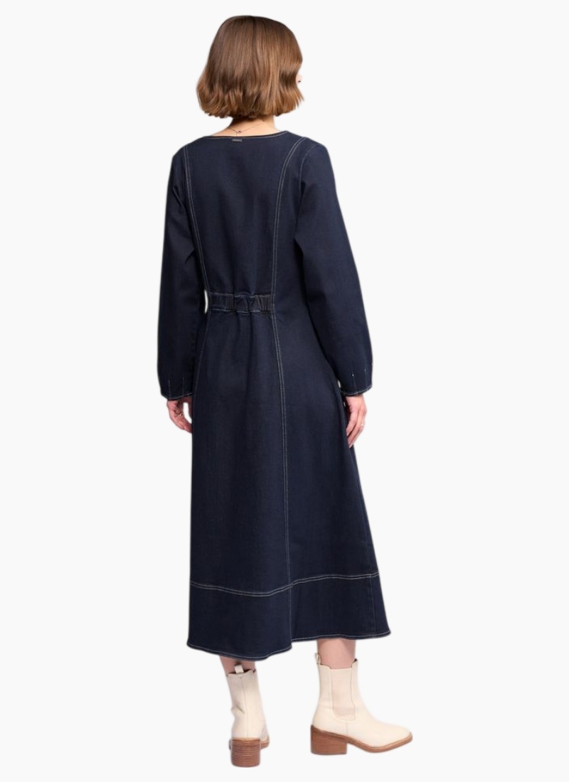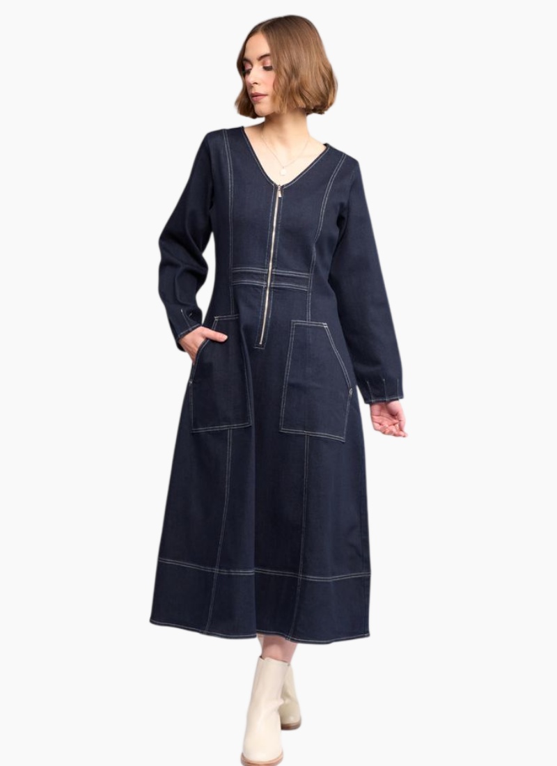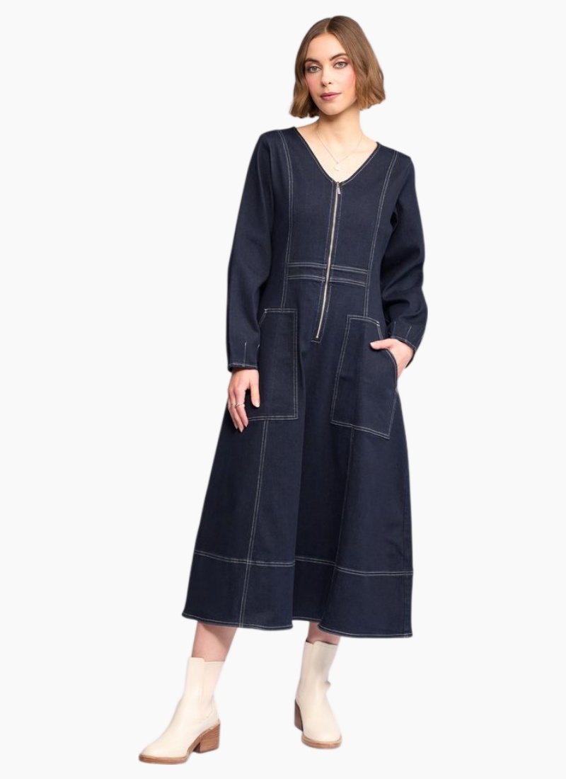 Introducing the PHOENIX Long Dress - Ink Denim from Knewe. This everyday statement dress melds utility details with a soft, feminine A-line silhouette.