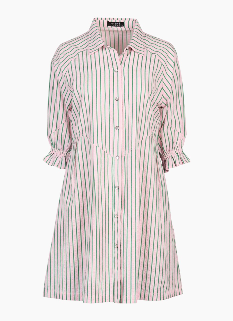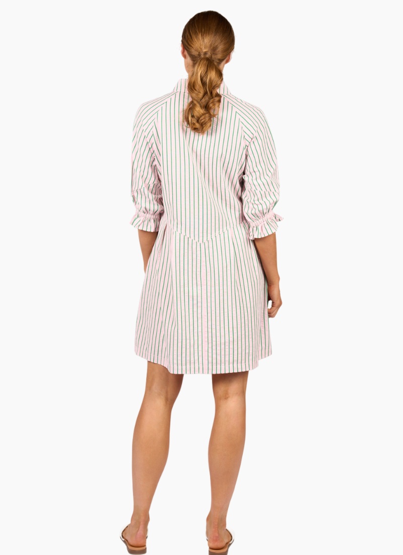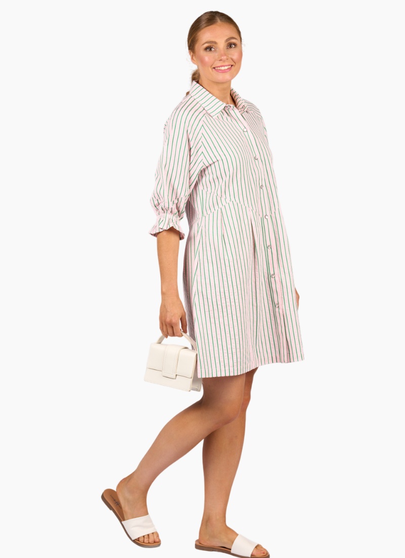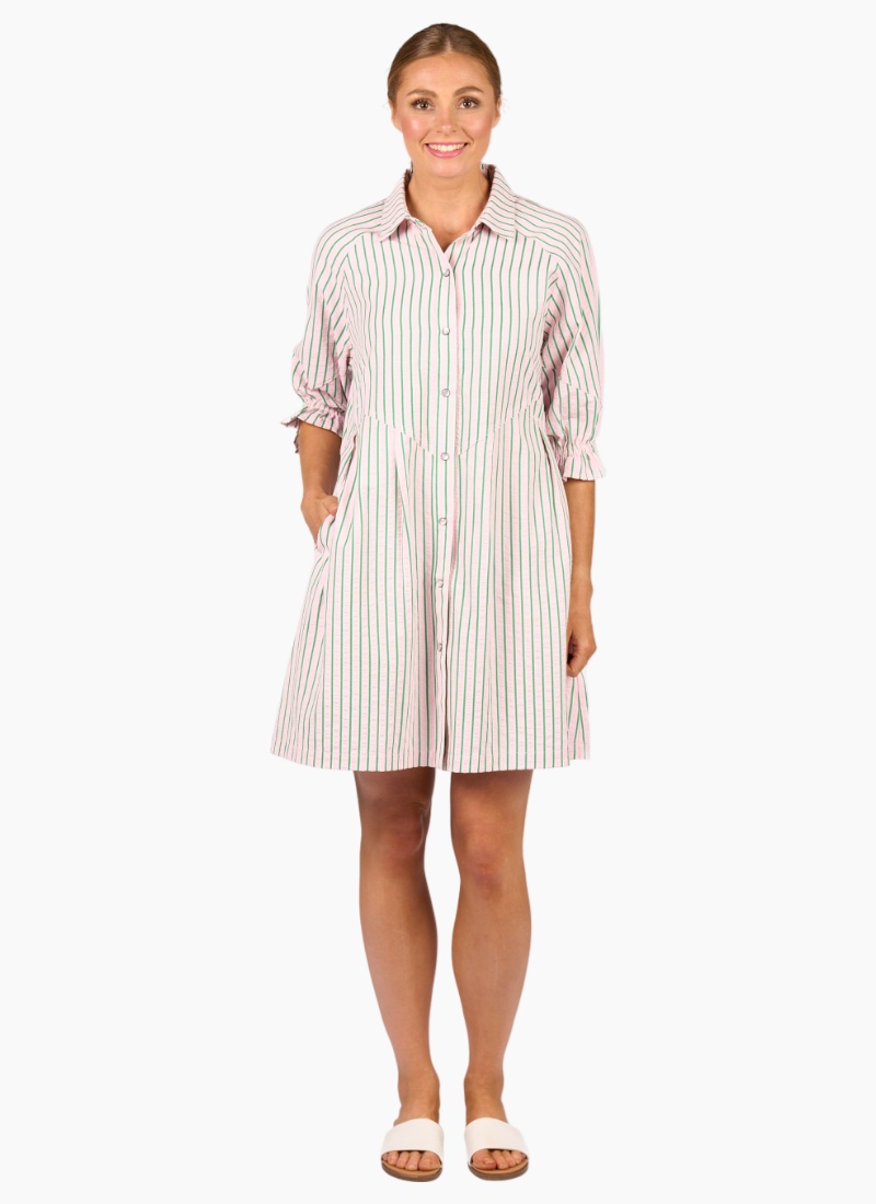 The Piper Dress in Candy Apple is an easy summer throw-on, cut in a crisp pink and green striped cotton-blend. With pleat detailing and soft raglan sleeves, it has a relaxed charm that makes everyday dressing feel a little more fun.• Made from a lightweight cotton/ polyester fabric • Mid length raglan sleeves with an elasticated cuff to wear above or below the elbow • Popper dome front fastening • Shirt collar • Side seam pockets • Angled seam details with pleats along side • Relaxed fit • Model is 175cm tall, and wears size 10