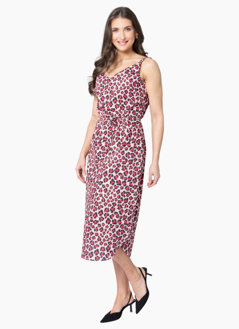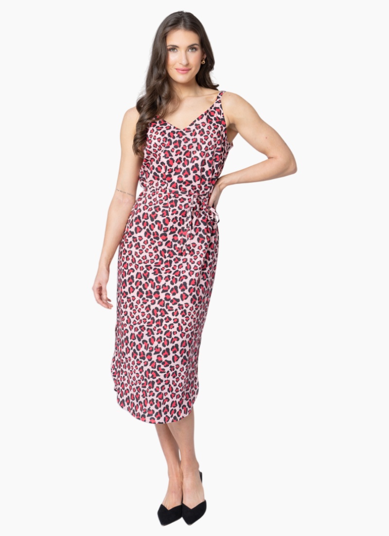 Introducing the Loyal Slip Dress from Leila + Luca. This effortless midi slip dress features a playful pink leopard print for contemporary laidback glamour.