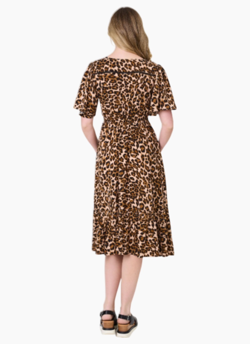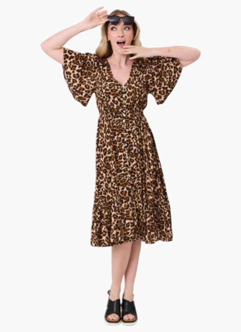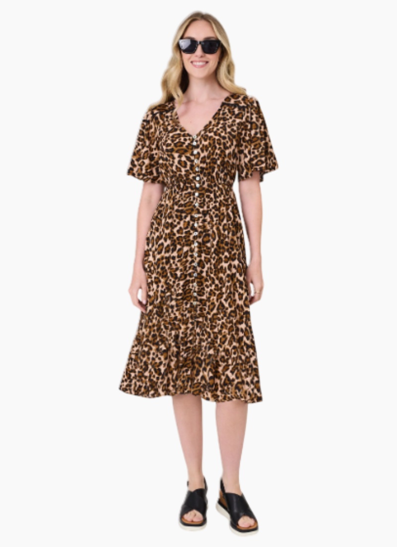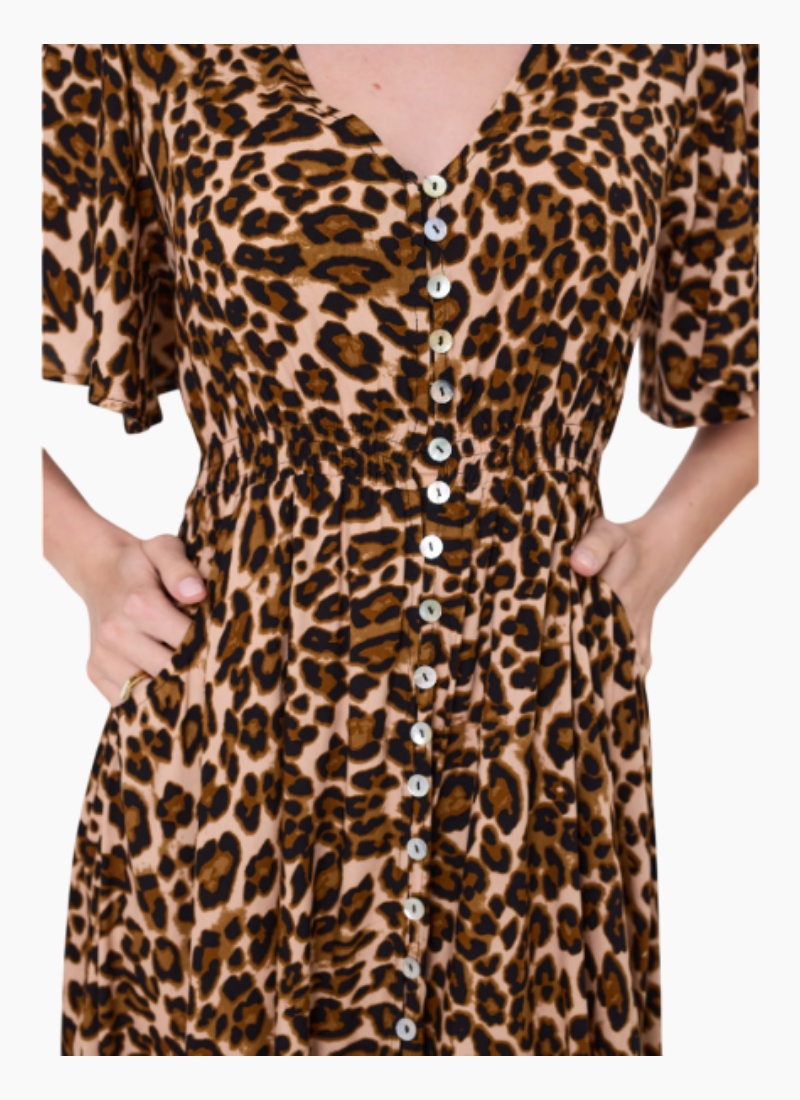 Introducing the VITTORIA DRESS from Lemon Tree. This leopard-print midi is a stylish choice for daytime and easy evenings.All-over leopard print with a flattering V-neck and short sleeves. Button-down front with a lightly frilled hem for a feminine touch. Made from 100% viscose for a soft, breathable feel. SKU: LTD260 Composition: 100% Viscose Care Instructions: Wash inside out, cold gentle wash with similar colours. Do not soak or bleach. Line dry in shade, do not tumble dry. Shrinkage may occur after wash, iron to restore. Cool iron on reverse. Do not dry clean. -