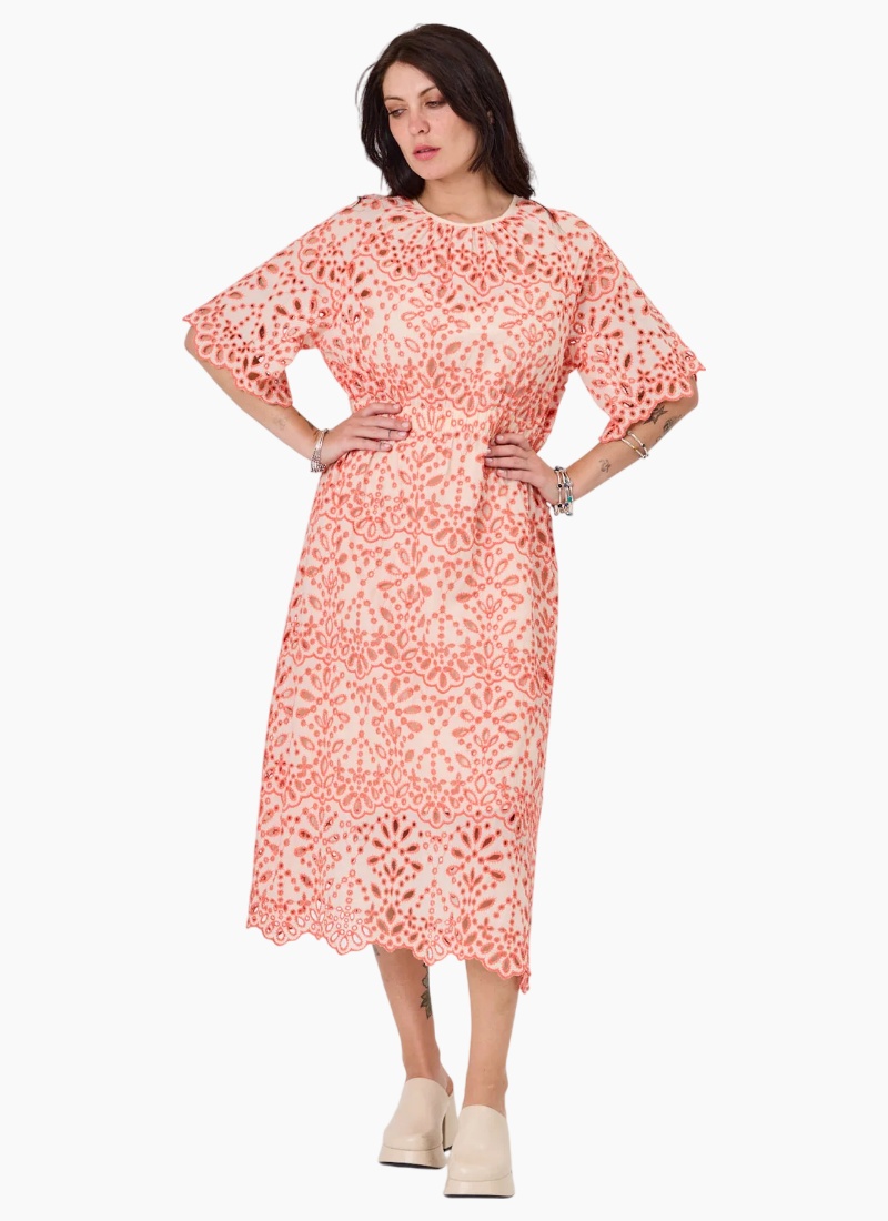 - A Casual/Day Dress in a warm melon colour crafted from cotton eyelet for breathable, textured comfort