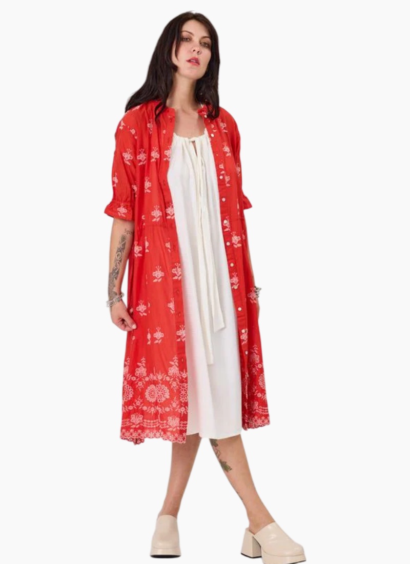 - Strawberry Lace from Libertine. A breezy, embroidered casual day dress in a vibrant strawberry red, designed for effortless summer style and easy layering.