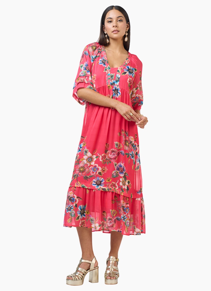ARRIVING EARLY NOVEMBERIntroducing the Zinnia Midi Dress-Rouge multi from Loobies Story. This vibrant floral day dress brings effortless bohemian charm to your wardrobe.