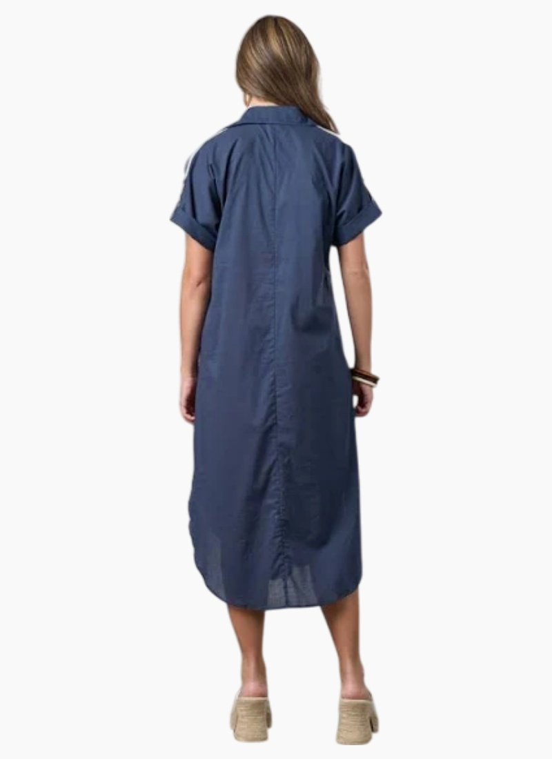 - Button-front shirt dress with a classic collar and cuffed short sleeves