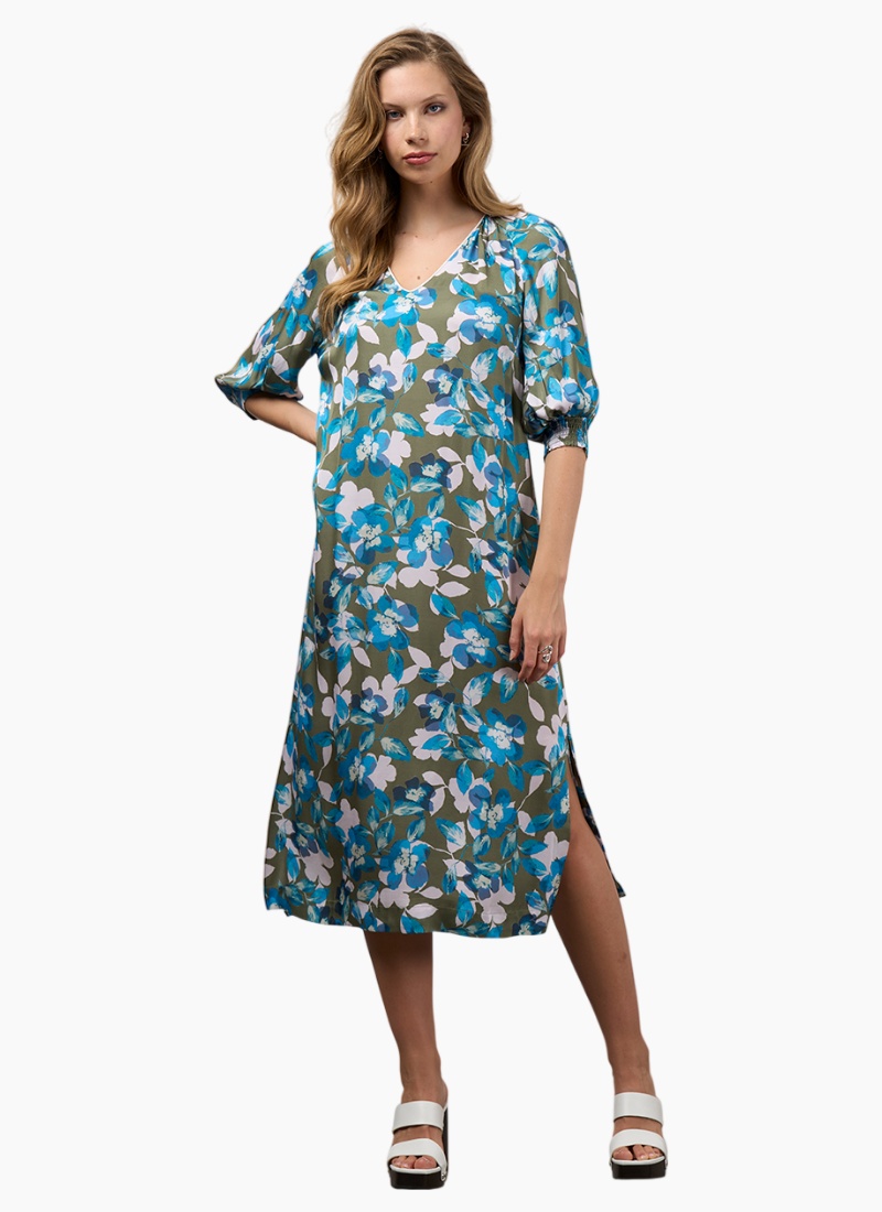 This exquisite midi-length dress showcases a captivating printed pattern that effortlessly combines sophistication with style. The enchanting 3/4 length blouson sleeves billow gracefully, featuring partially shirred cuffs that add a touch of delicate charm. Dramatic deep side splits at the hemline lend an alluring edge, allowing for graceful movement and a hint of allure with every step. Additionally, the dress is beautifully framed with striking contrast insert piping along the neckline, enhancing its refined silhouette. Satin viscose - 55% viscose, 45% rayon in autumn tones