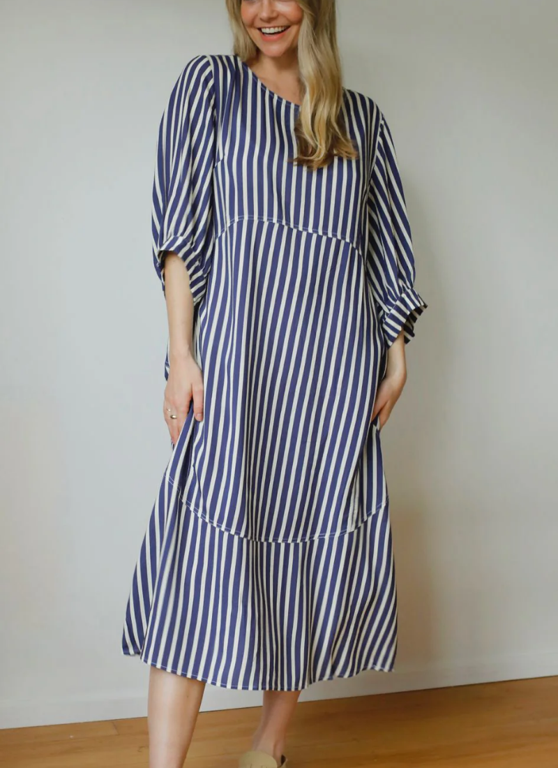 Experience elegance from MI Moso with the Cocoon Dress in Navy Stripe, crafted from premium fabric that offers both comfort and style. Its exceptional shape flatters your silhouette, making it perfect for any occasion where sophistication is key.Designed with expert attention to detail, this dress combines a timeless pattern with a modern fit for a refined look. 100% rayon - beautifully soft to wear.