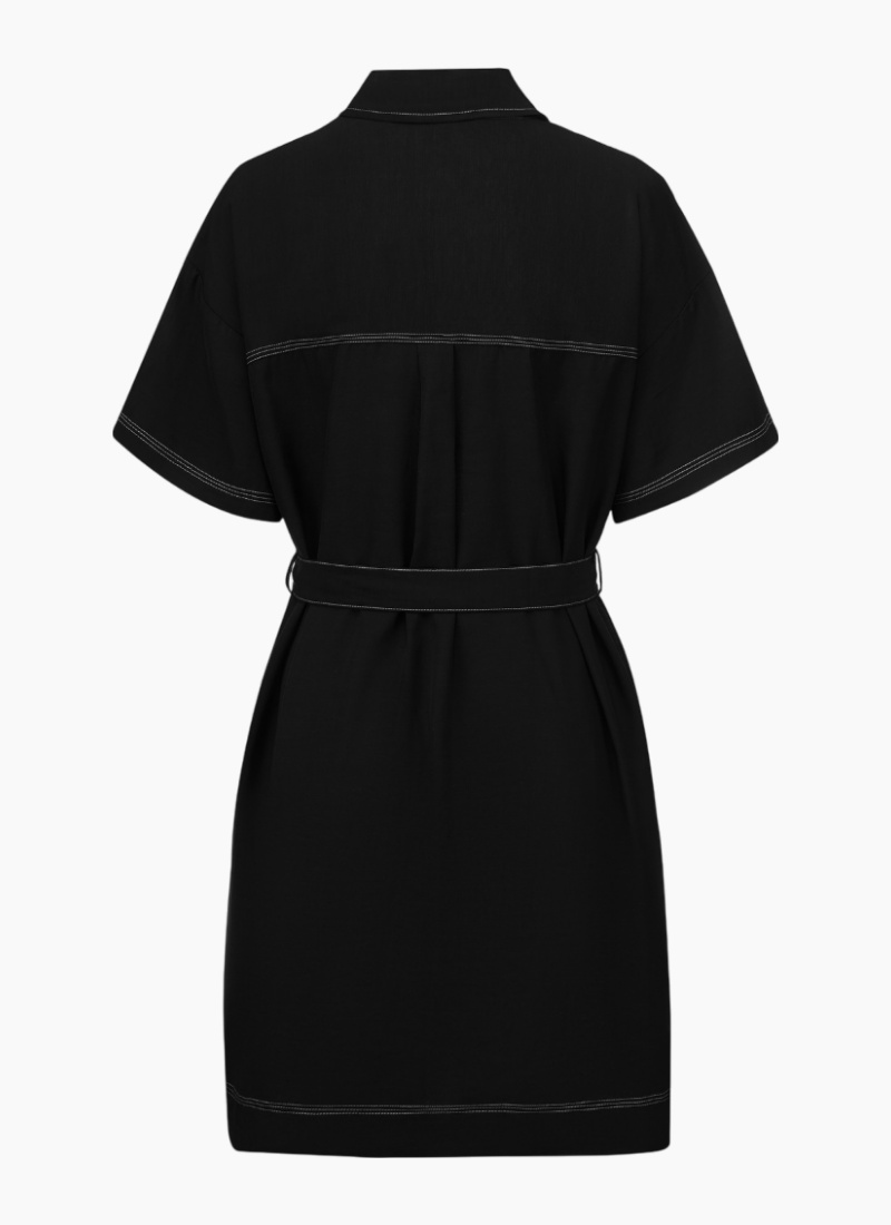 - Contrast white topstitching and a self-fabric belt define the waist with modern detailing