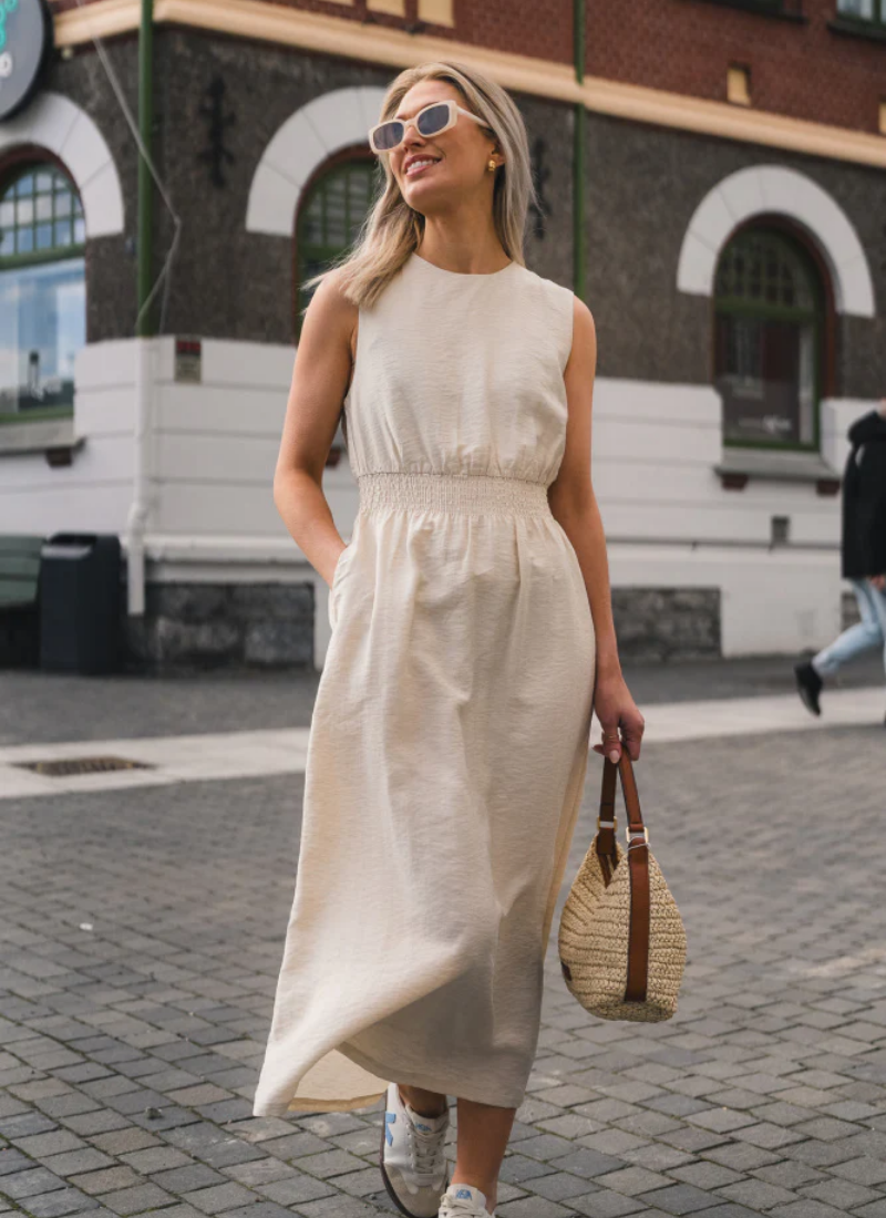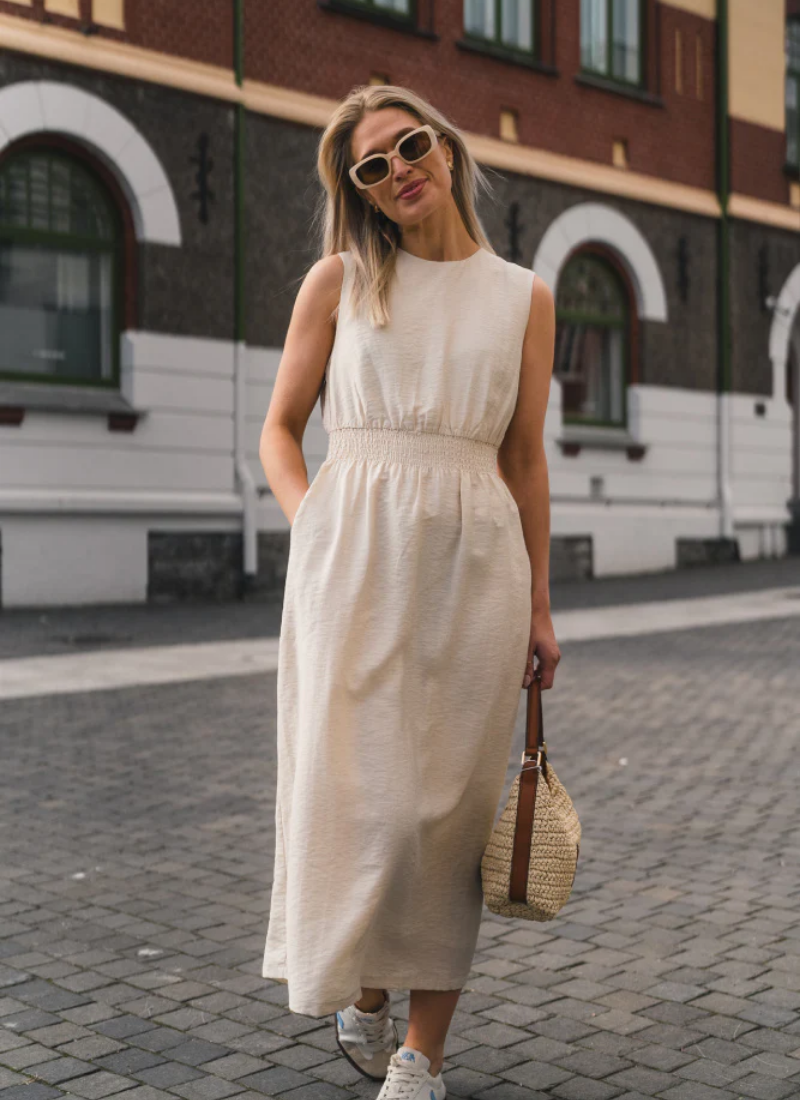 Disa is a lightweight material, perfect for the warmer days. The dress features a sleeveless design, with a mock detail around the waist and it has hidden side pockets.