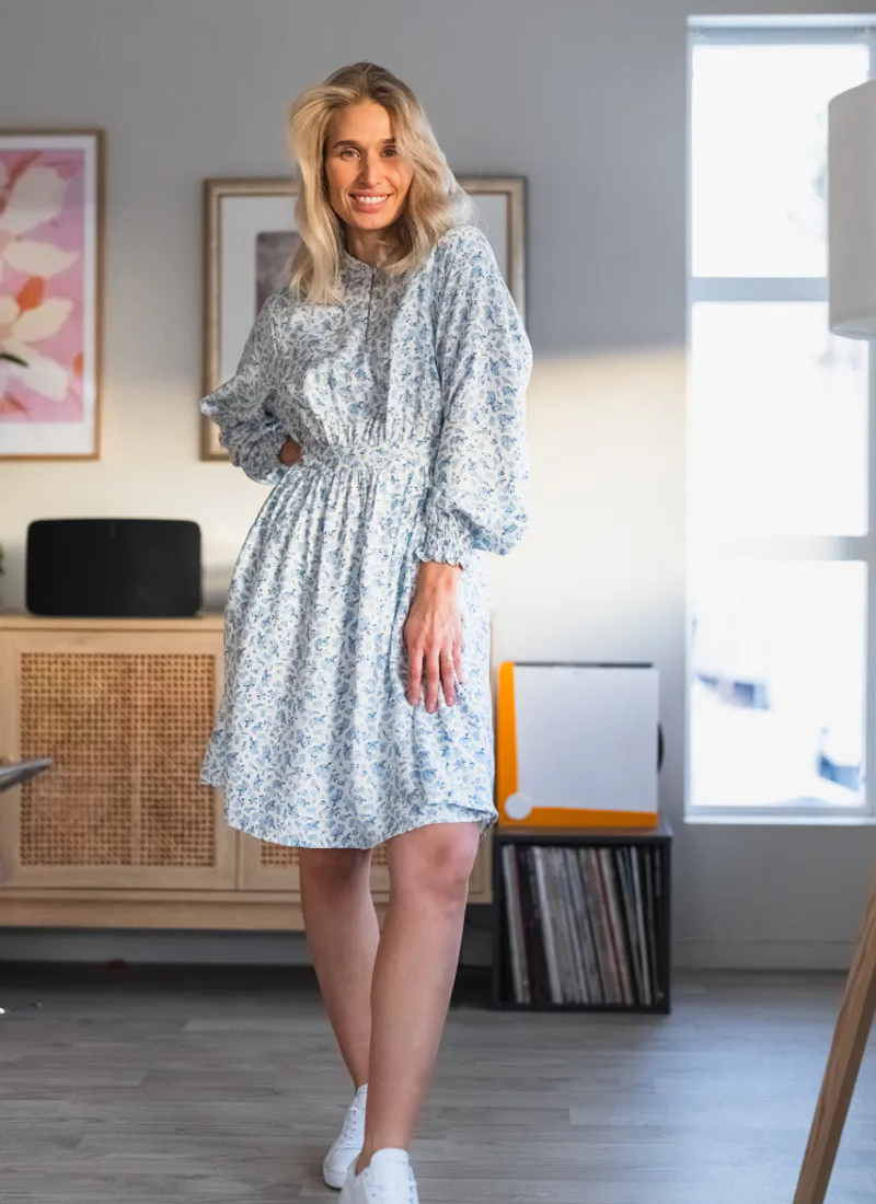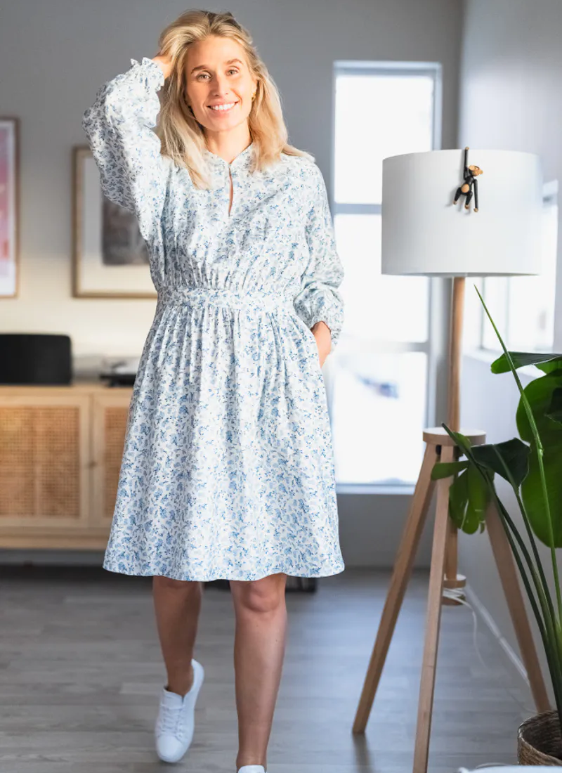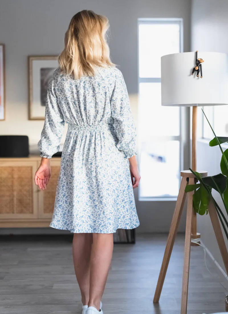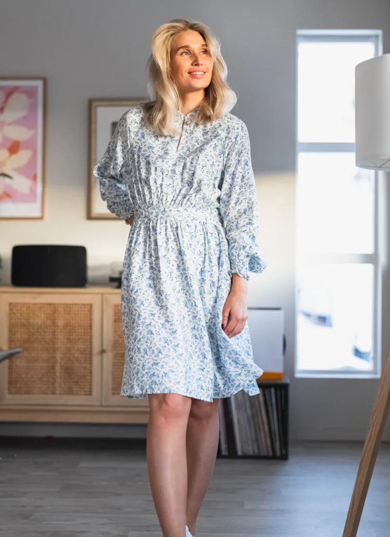 Cajsa is a floral print in soft blue tones. The dress features a round neckline, with a keyhole detail, a synched waist and long sleeves with an elastic cuff.