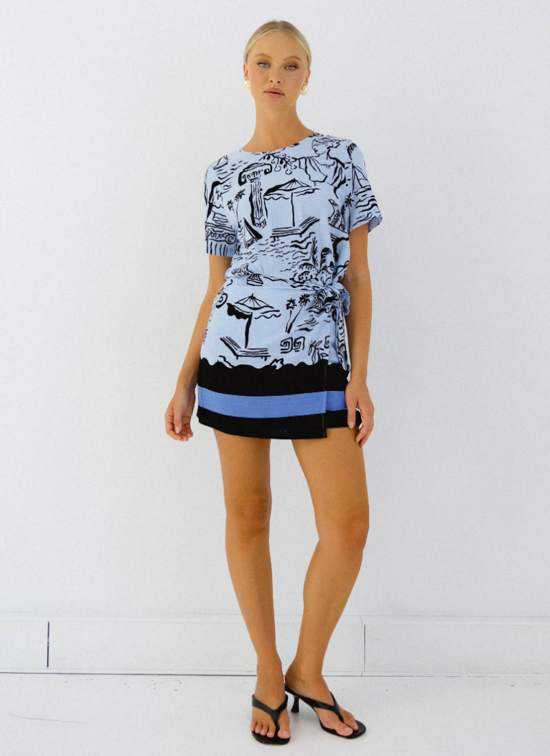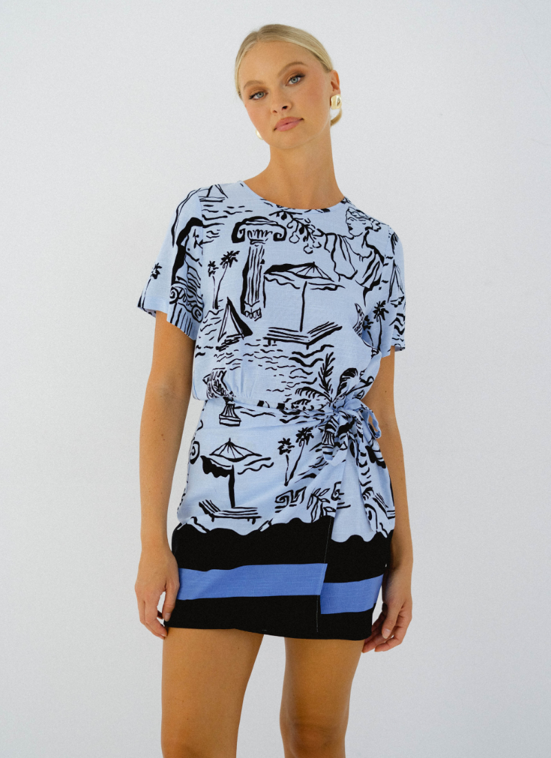 - Sky-blue base with bold black graphic print provides a fresh, eye-catching colour story