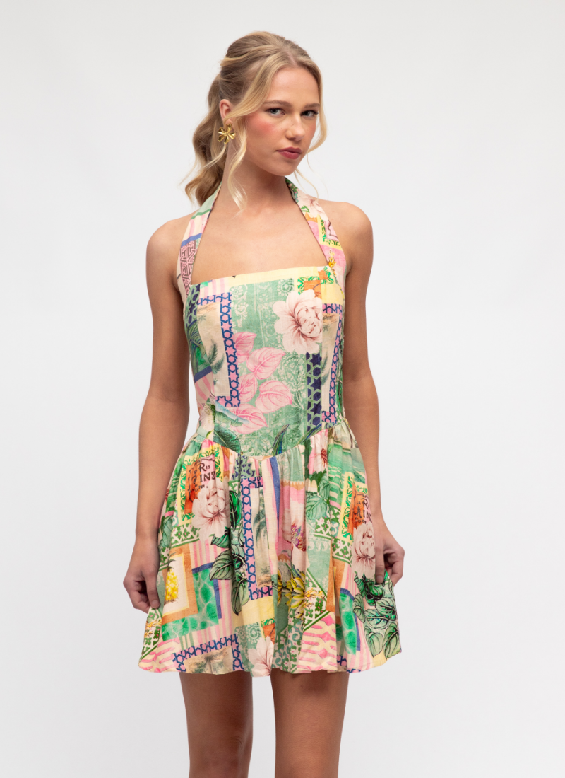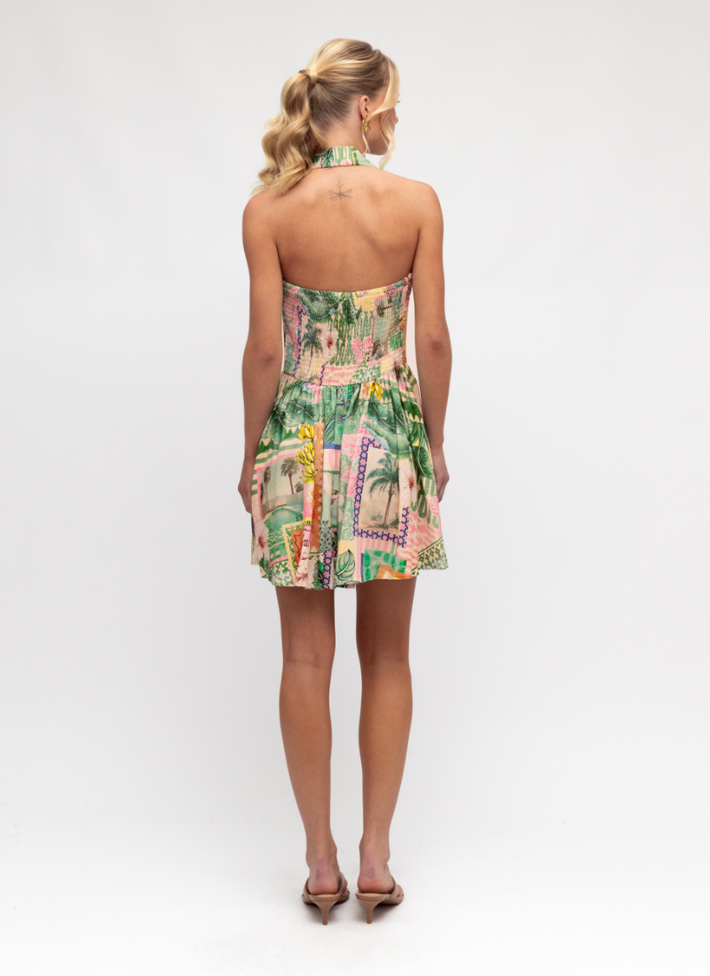Introducing the Sao Paulo Short Halter Dress from Paper Heart. A playful, sun-ready piece that combines a fitted halter bodice with a breezy, gathered mini skirt for effortless summer style.