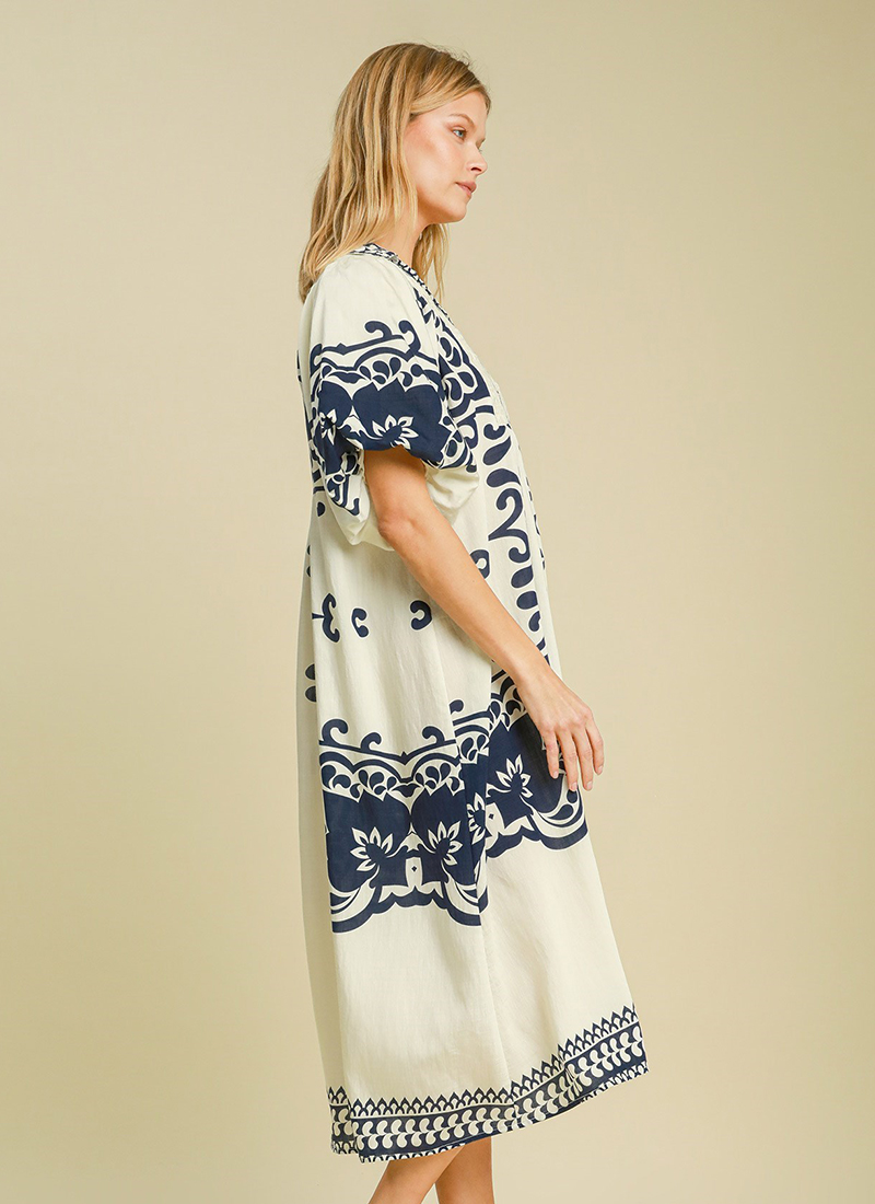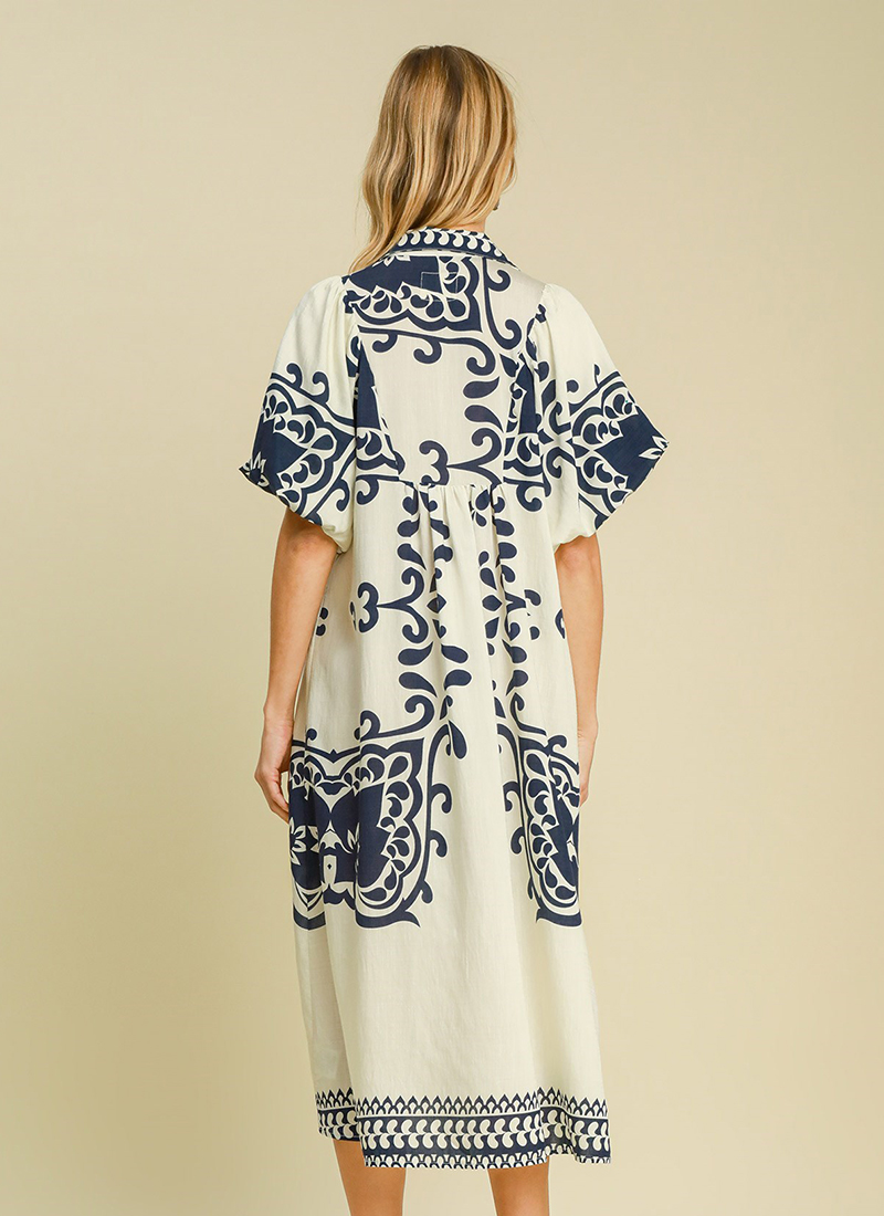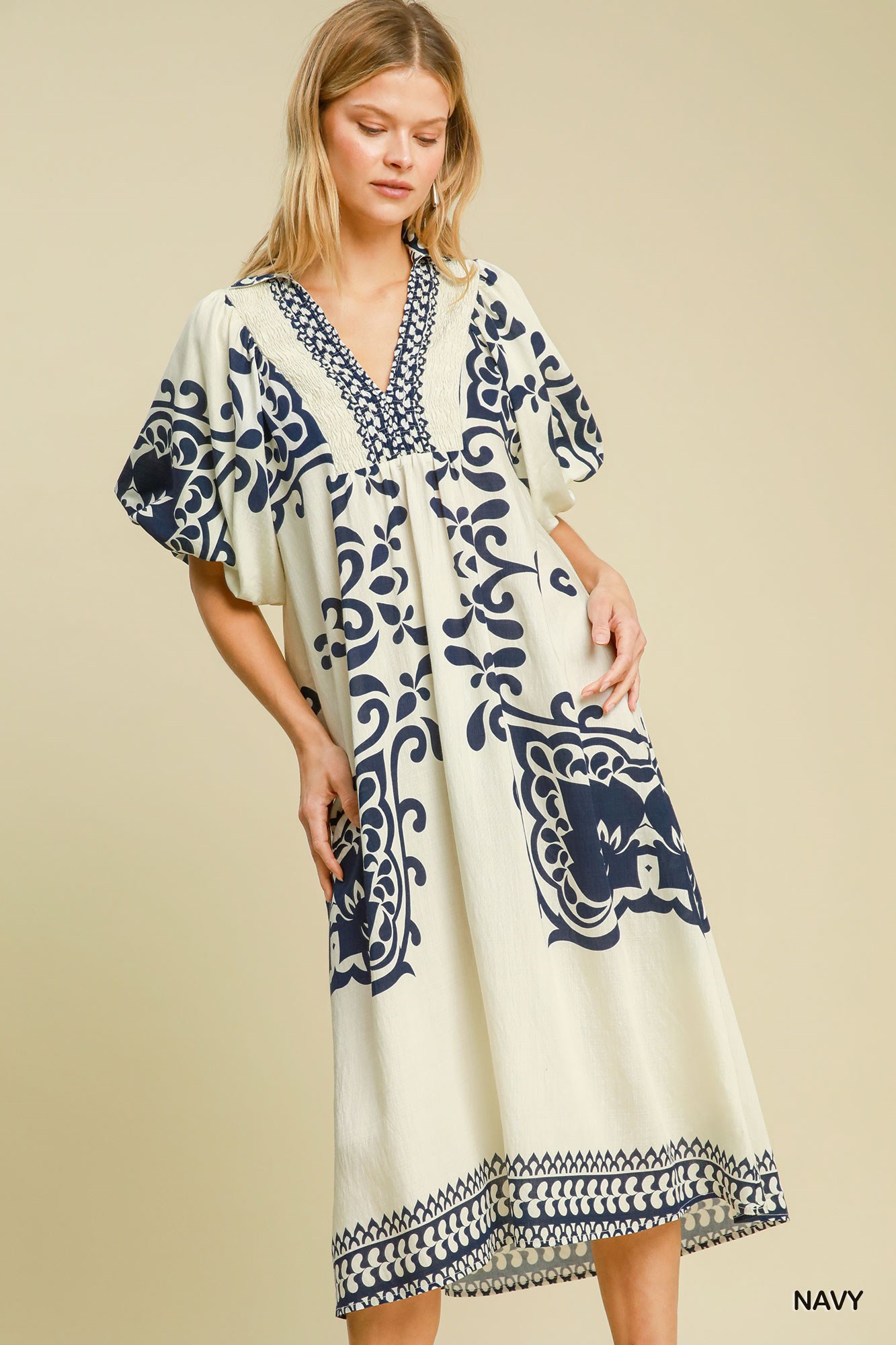 This boarder print midi dress is perfect for achieving put-together look with minimal effort. The puffed sleeves and floral print make it a sweet option for semi-formal occasions.