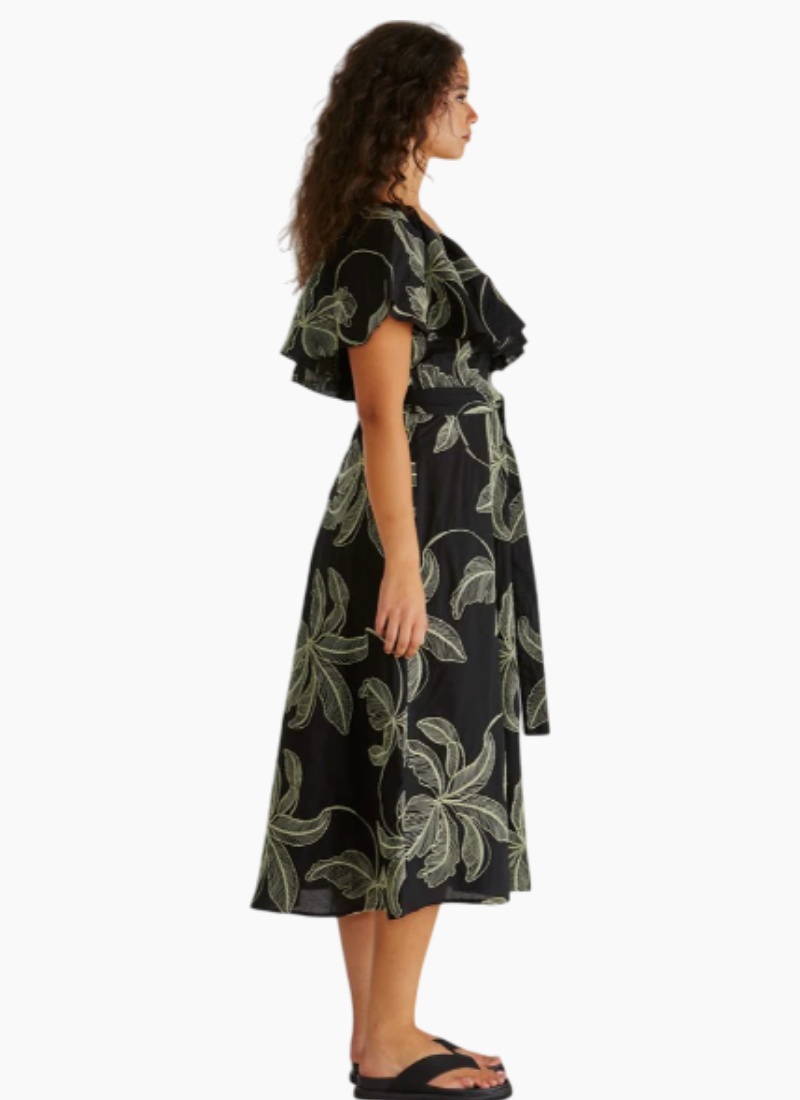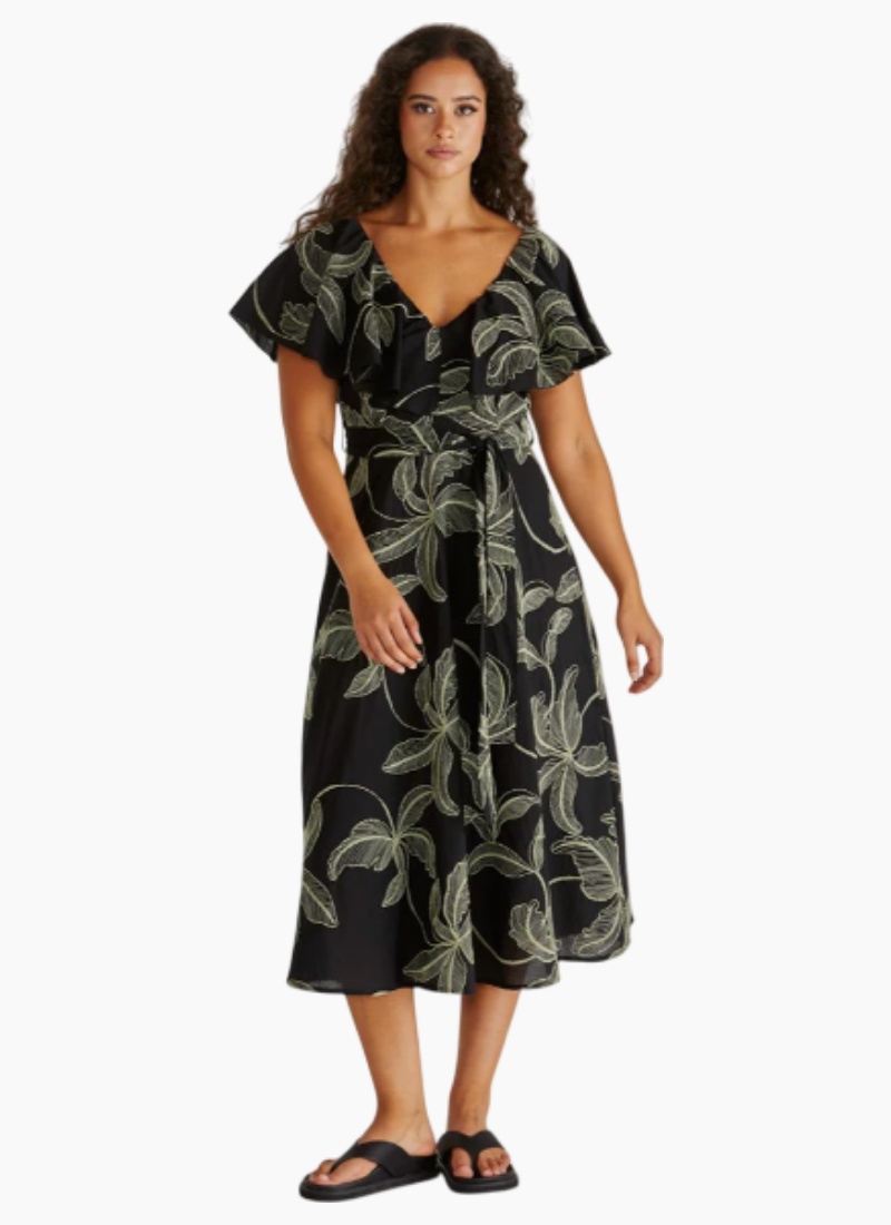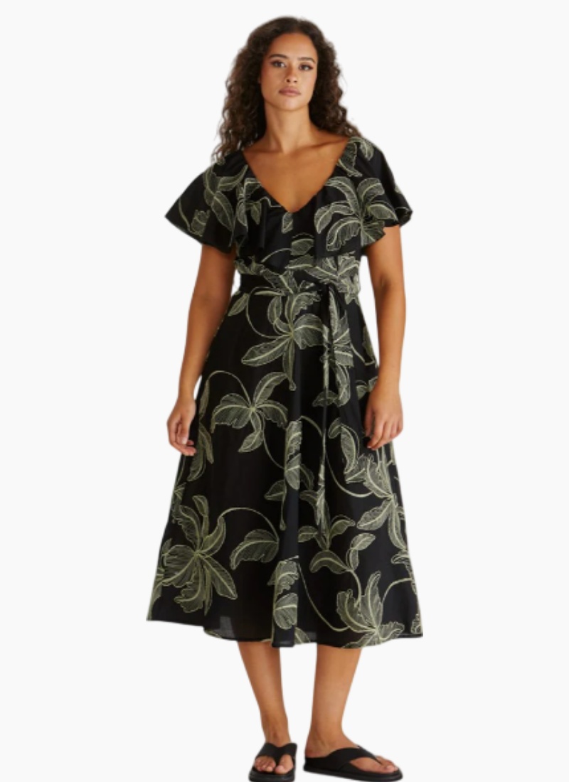 Introducing the Rositta Ruffle Dress from SASS. This feminine midi offers an easy, elegant silhouette with a soft ruffled neckline and botanical print.The Rosita Dress is all things flirty and fun. Crafted in embroidered fabric with frill detailing and a self-tie waist, it’s made to flatter. Easy, effortless, and ready for sunshine days.