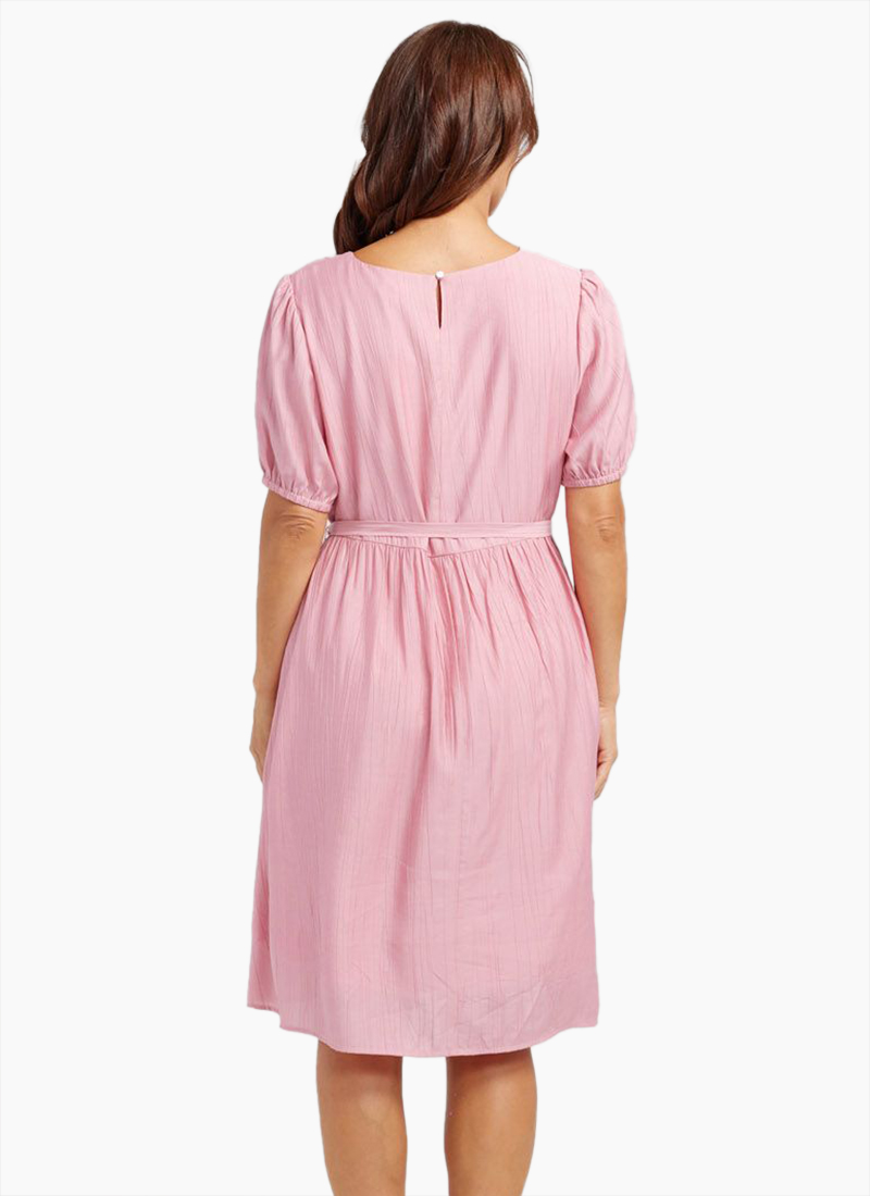 This knee-length dress offers a relaxed yet polished look with elasticated short sleeves, a smocked front bodice for a comfortable fit, and a self-tie detail around the waist, ensuring effortless style and versatility for any occasion