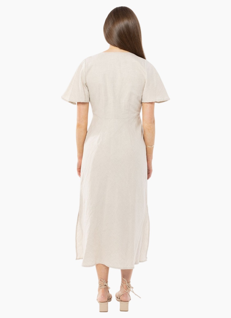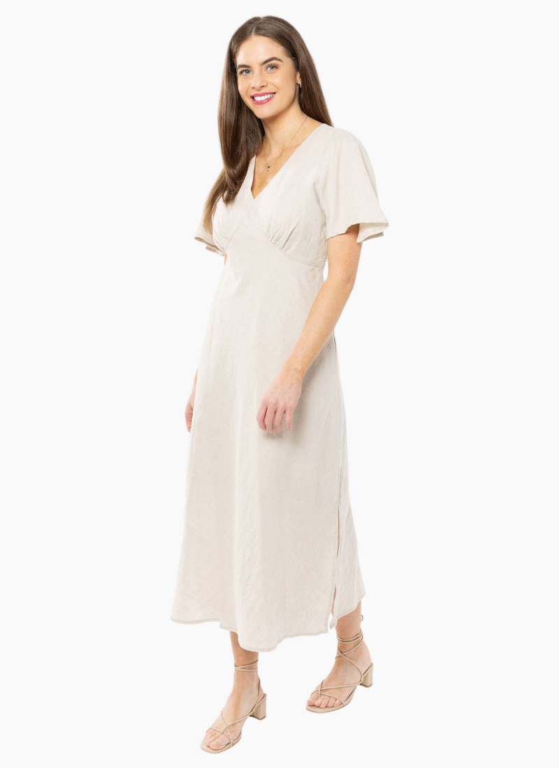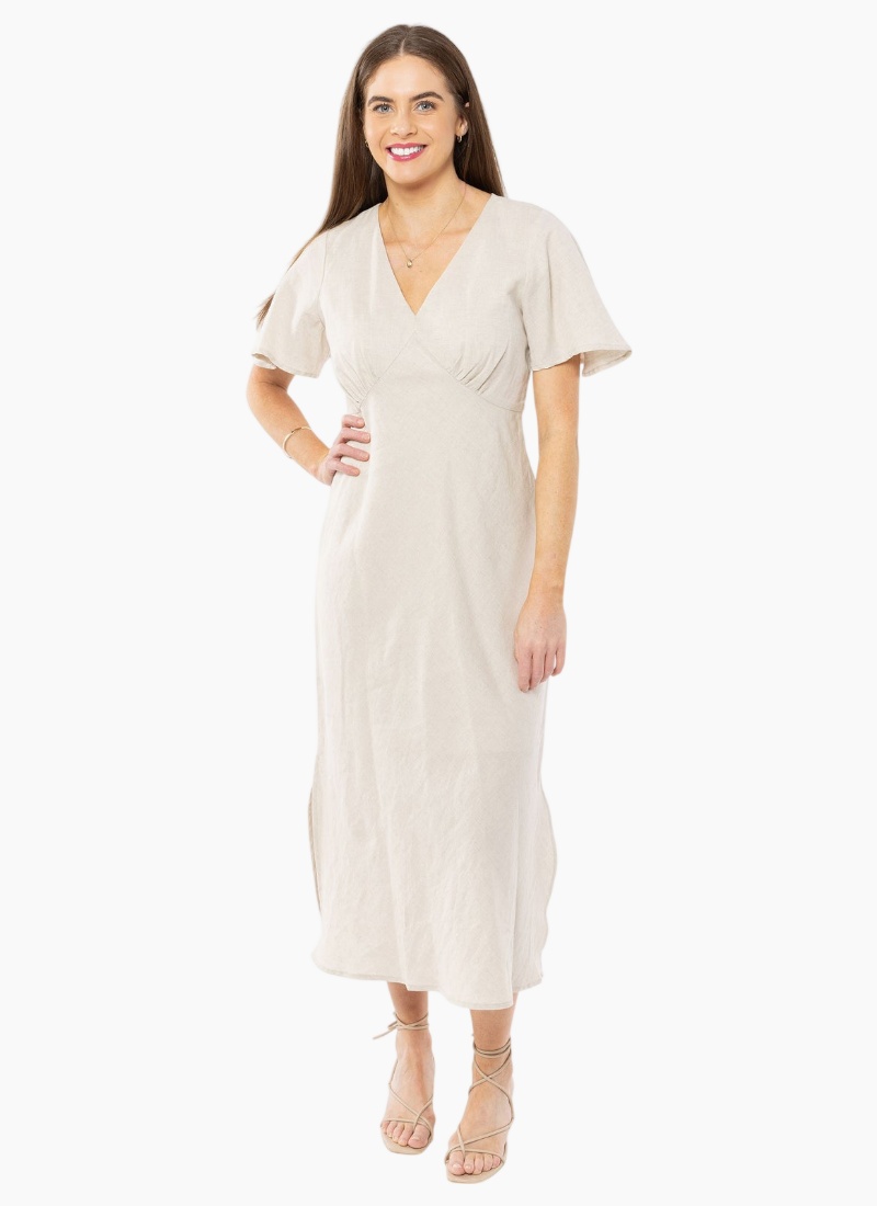 Discover why the Applause Dress has earned its name. This berry beauty combines a flattering V-neckline with graceful flutter sleeves that move with you, delivering the comfort you crave without compromising on style. The hidden bonus? Functional pockets that make this dress as practical as it is gorgeous. Elevate your everyday with a piece that truly does it all.Linen V neckline Flutter sleeves Splits at sides Invisible zip at side Side seam pockets