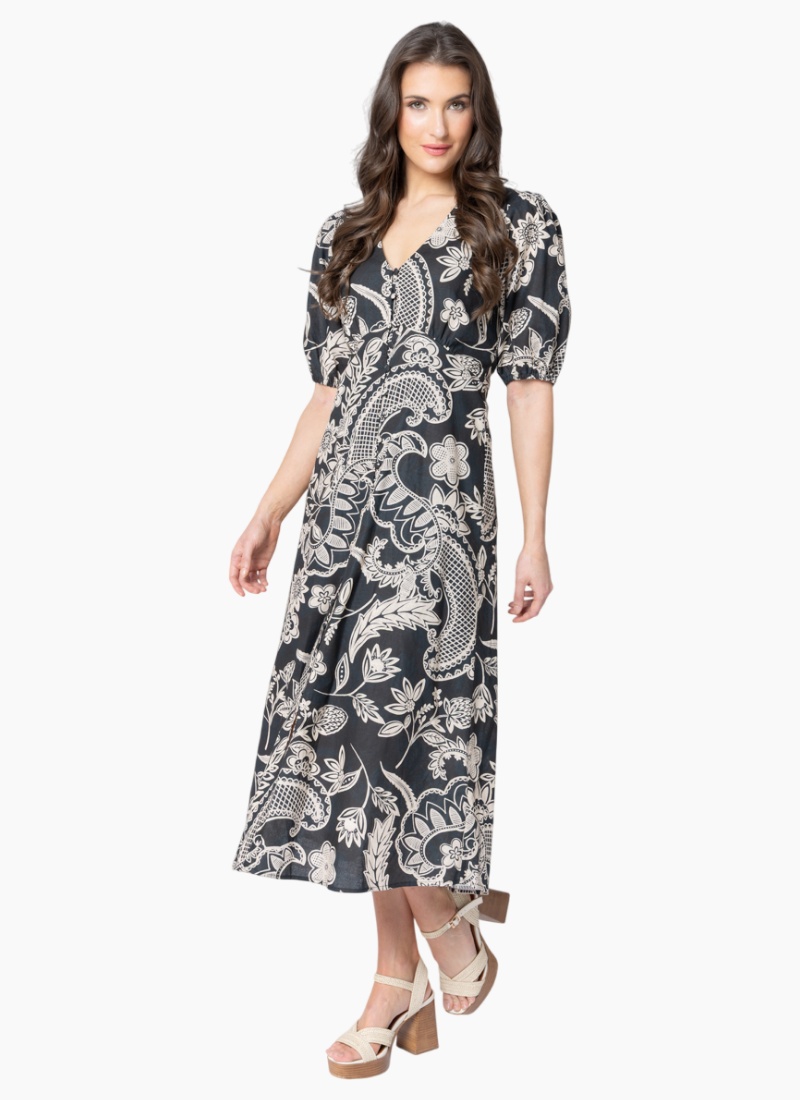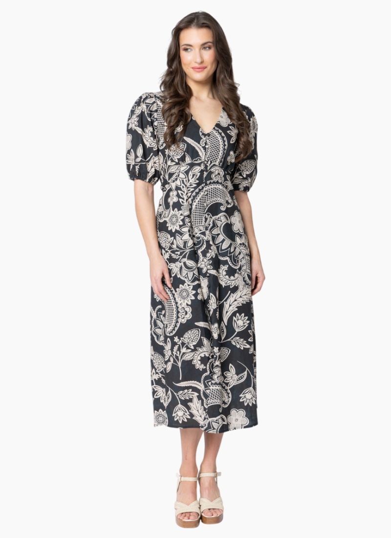 The Cheerful Dress is a beautiful and versatile midi-length dress that makes a stylish statement. This elegant piece features a flattering V-neckline and chic puff sleeves with elastic cuffs, creating a feminine and sophisticated silhouette. The fitted bodice flows into a relaxed, A-line skirt, ensuring both comfort and a lovely drape.Crafted from 100% cotton, this dress is soft, breathable, and perfect for warm weather. The intricate Sand Flower print combines a black base with a detailed, floral, and paisley-inspired pattern in a soft, sandy cream color. This striking design makes it ideal for a variety of occasions, from casual outings to more formal events.